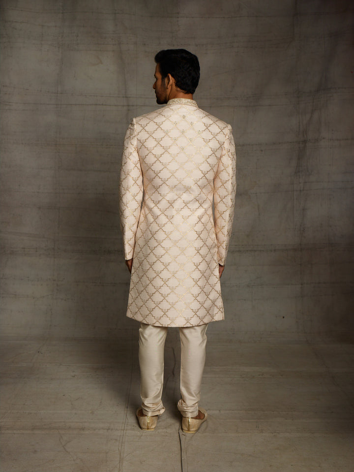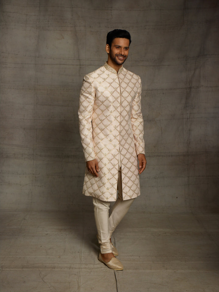 This is a simple yet elegant sherwani in gold color with zardose work on neckline.