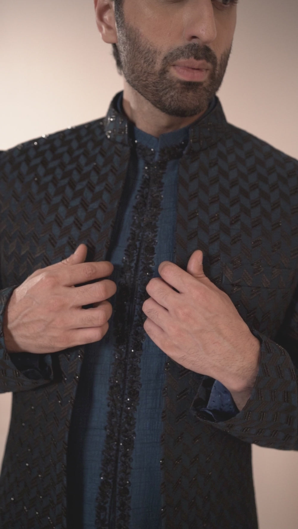This is a 4 piece set of Teal Blue embroidered Indo- Western in Silk Jacket & Bandi with black silk trousers and a black shirt.