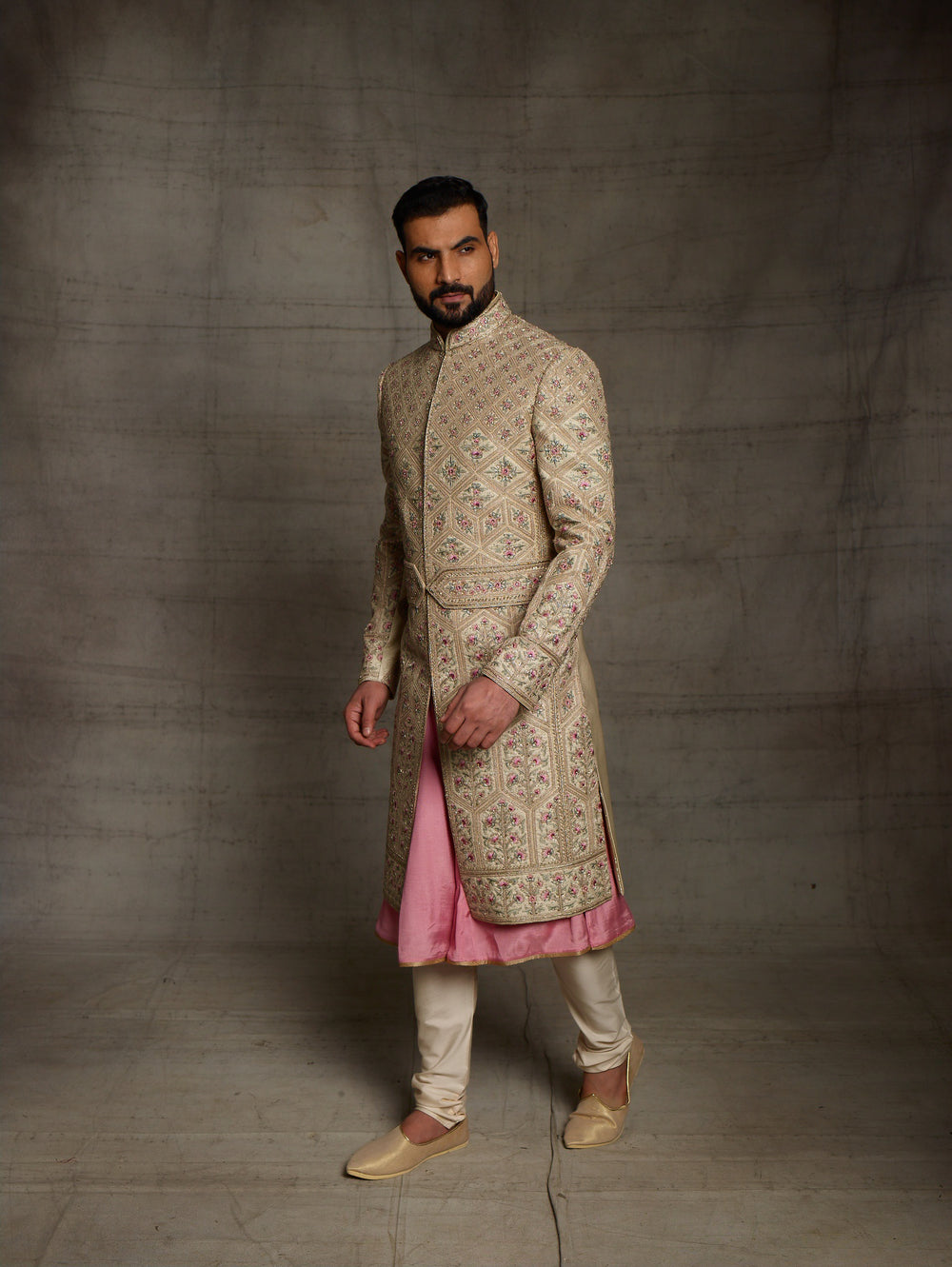 This is a beige sherwani with unique heavy zardose motifs placed geometrically and onion pink highlights. It comes with a matching kamarbandh.