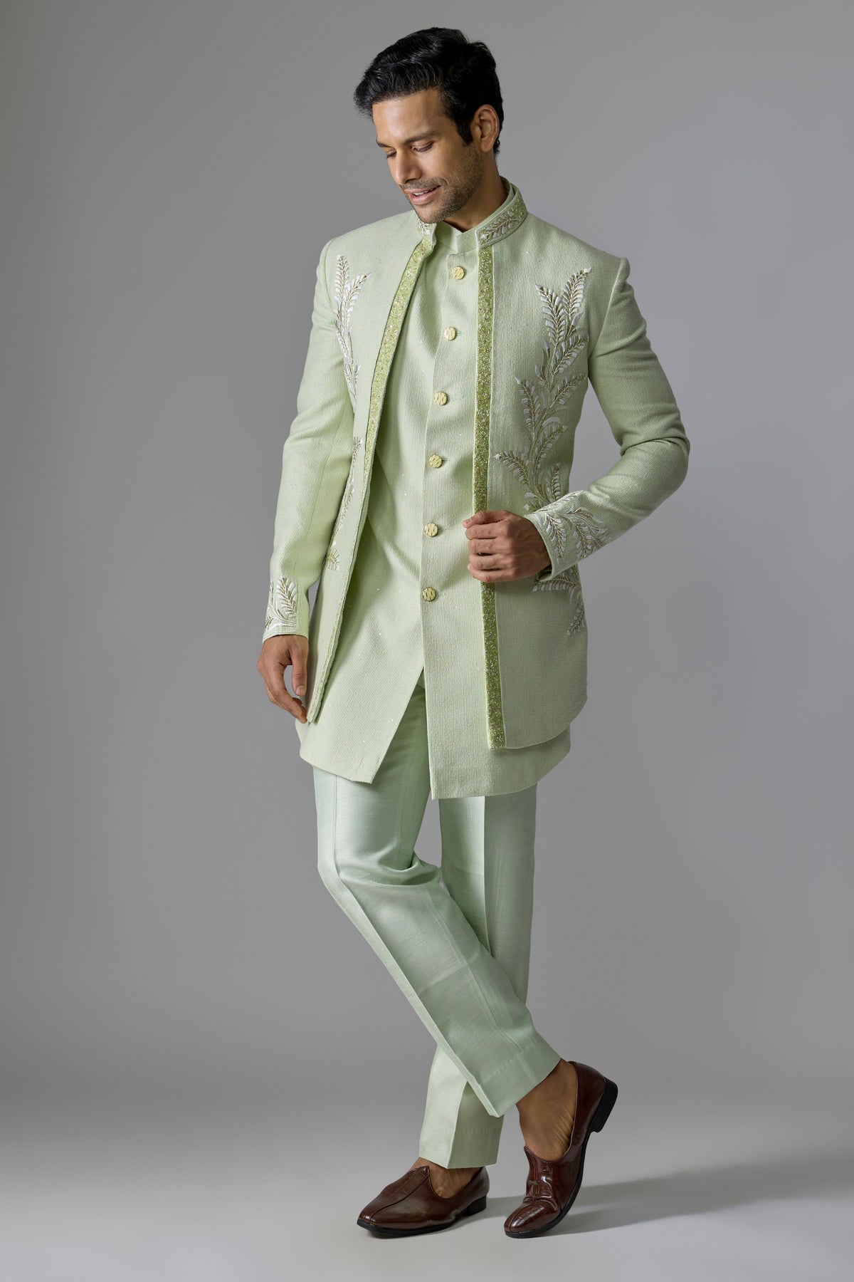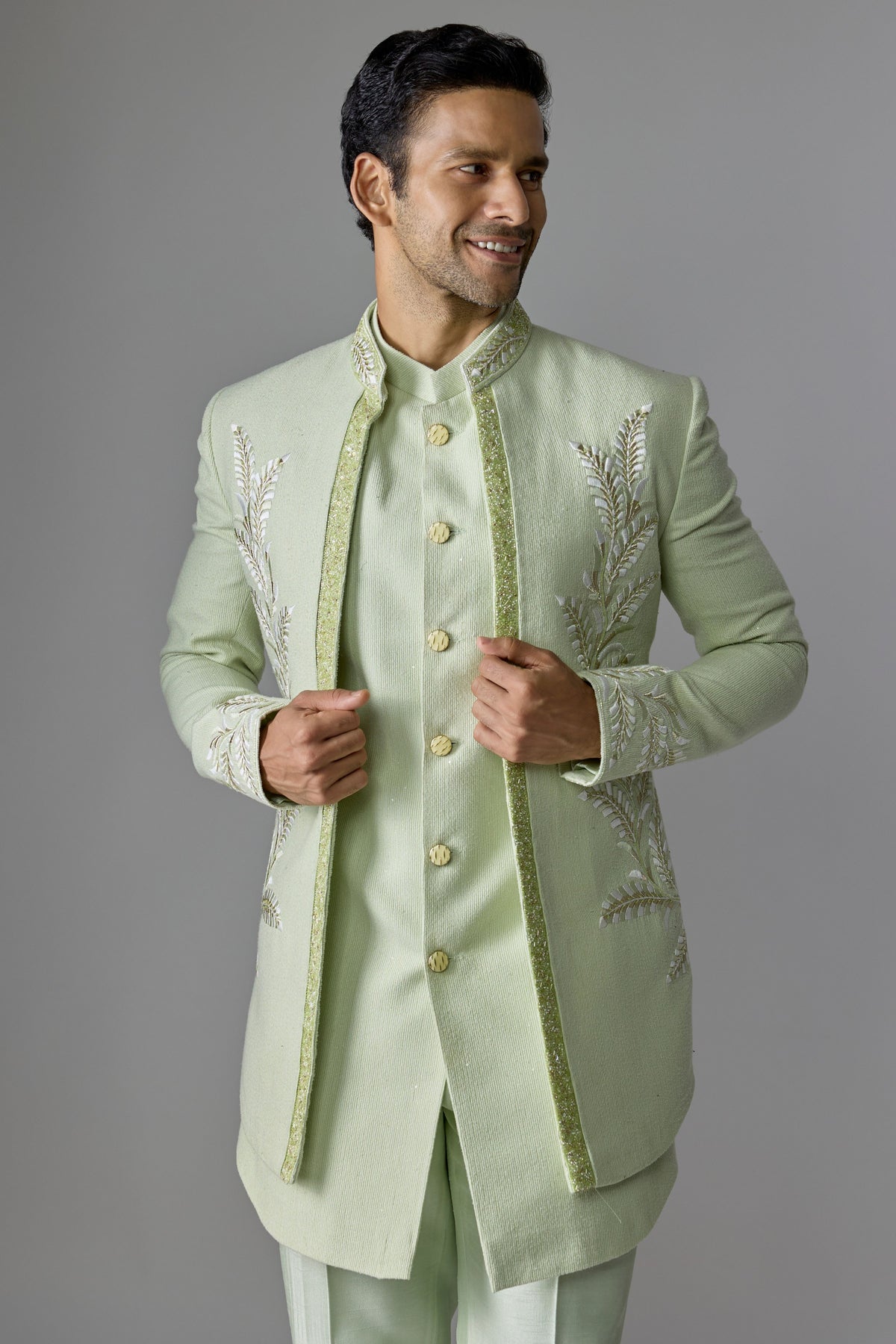 This elegant Green Indo-Western is tailored from luxurious silk fabric and embellished with intricate thread, pearl, sequin, cutdana, and salli embroidery. Designed for refined sophistication, it’s perfect for weddings, receptions, and festive celebrations.