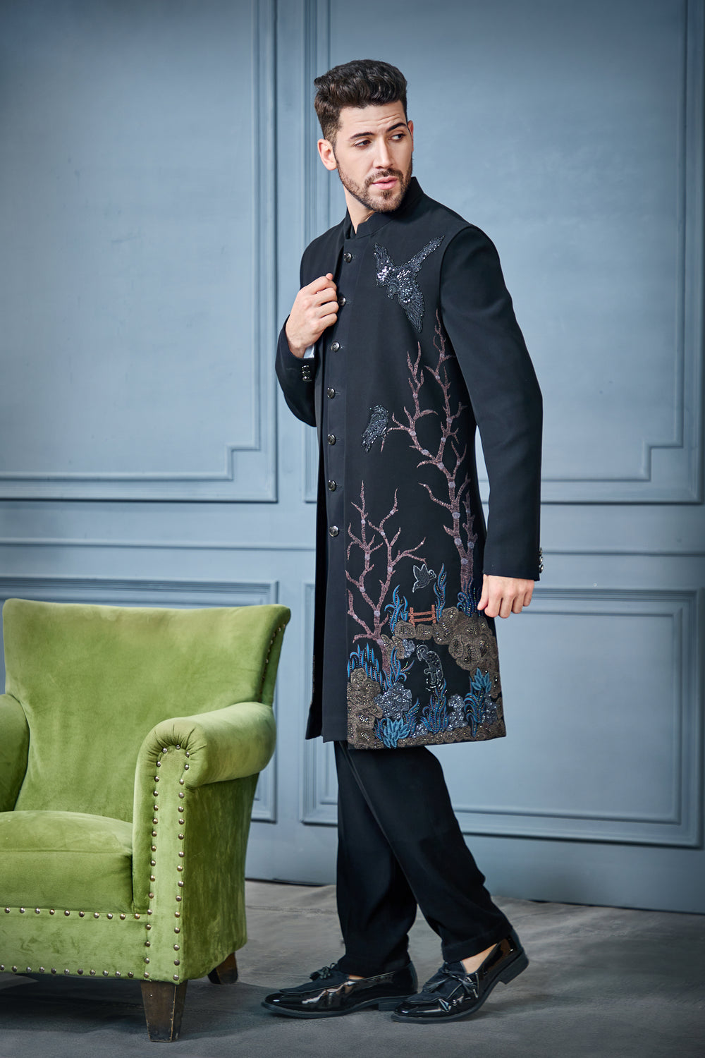 Product Details: This Black Indo-Western set features a captivating jungle theme, with bird and tree motifs brought to life through multicolour threadwork and intricate embellishments. Zari work, poth, sequin, and stone accents complete the design. A striking fusion of nature's beauty and luxurious craftsmanship.