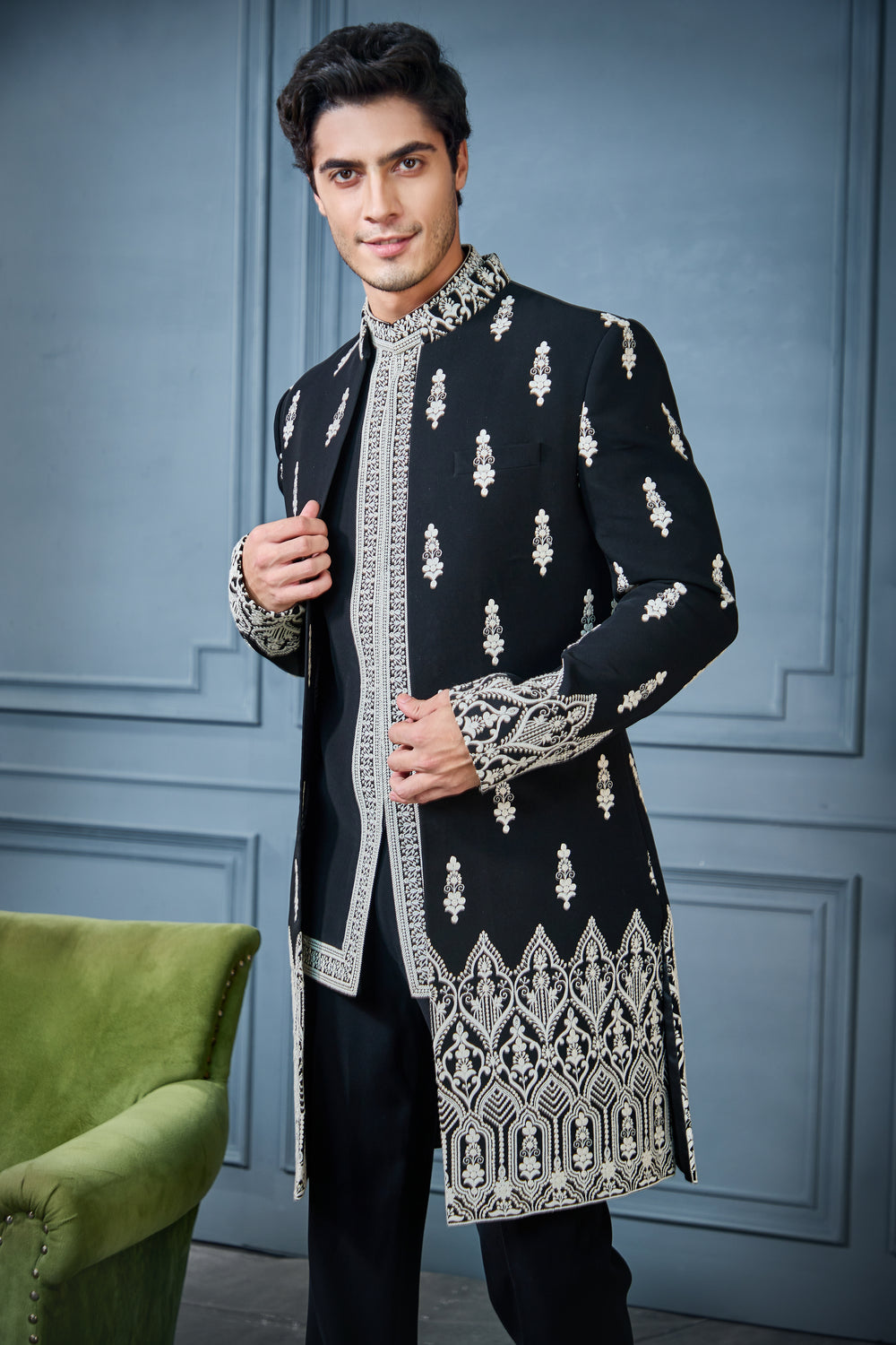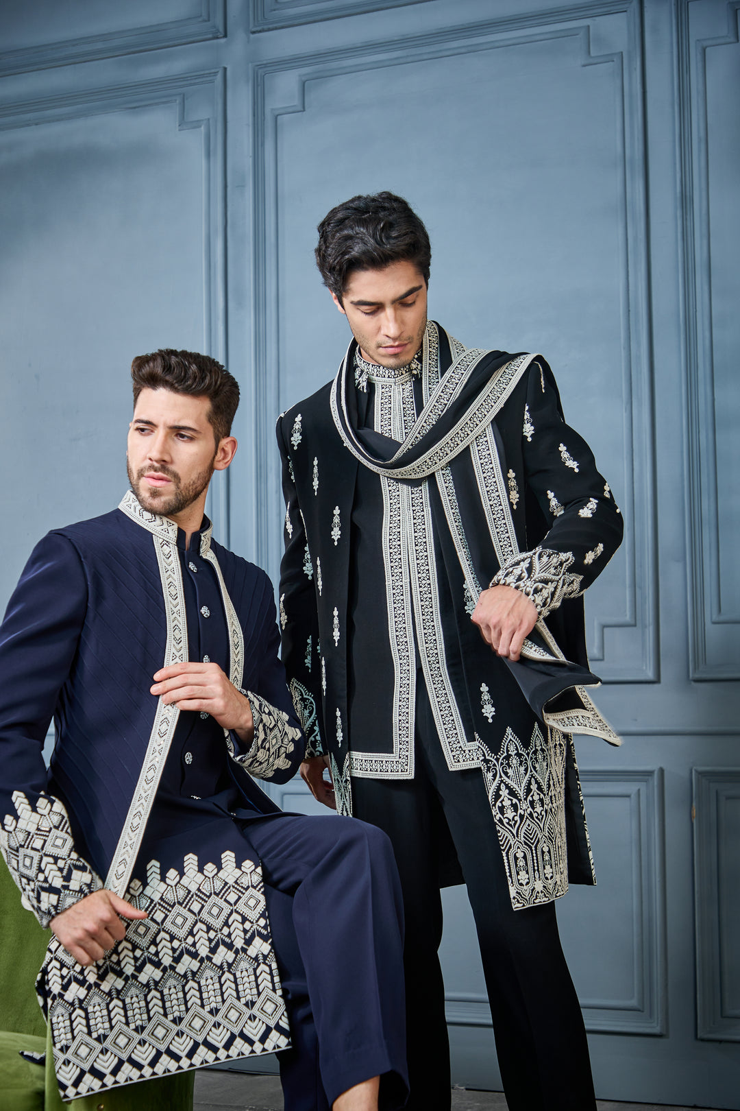This black Indo-Western set beautifully combines tradition and elegance with its bundi jacket, kurta, trousers, and a flowing dupatta. Delicate ivory threadwork in intricate geometric patterns adds a classic Indian charm. Celebrate timeless style with a contemporary twist.