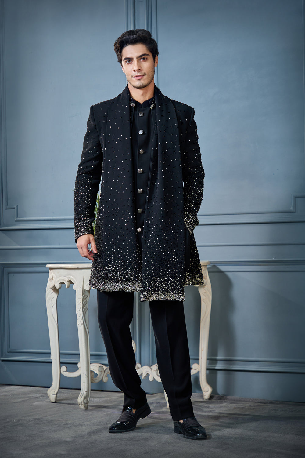 Product Details: This black Indo-Western set features bold metal salli work across the jacket and dupatta, creating a dramatic, striking effect. A show-stopping ensemble that combines modern elegance with daring craftsmanship, designed to make an impact.