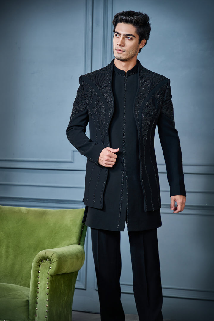 This black Indo-Western set features a uniquely cut Indo jacket with a wave design, adorned with salli, poth, and sequin embroidery, enhanced by satin patchwork. A bold fusion of abstract art and modern sophistication, with every curve making a statement.