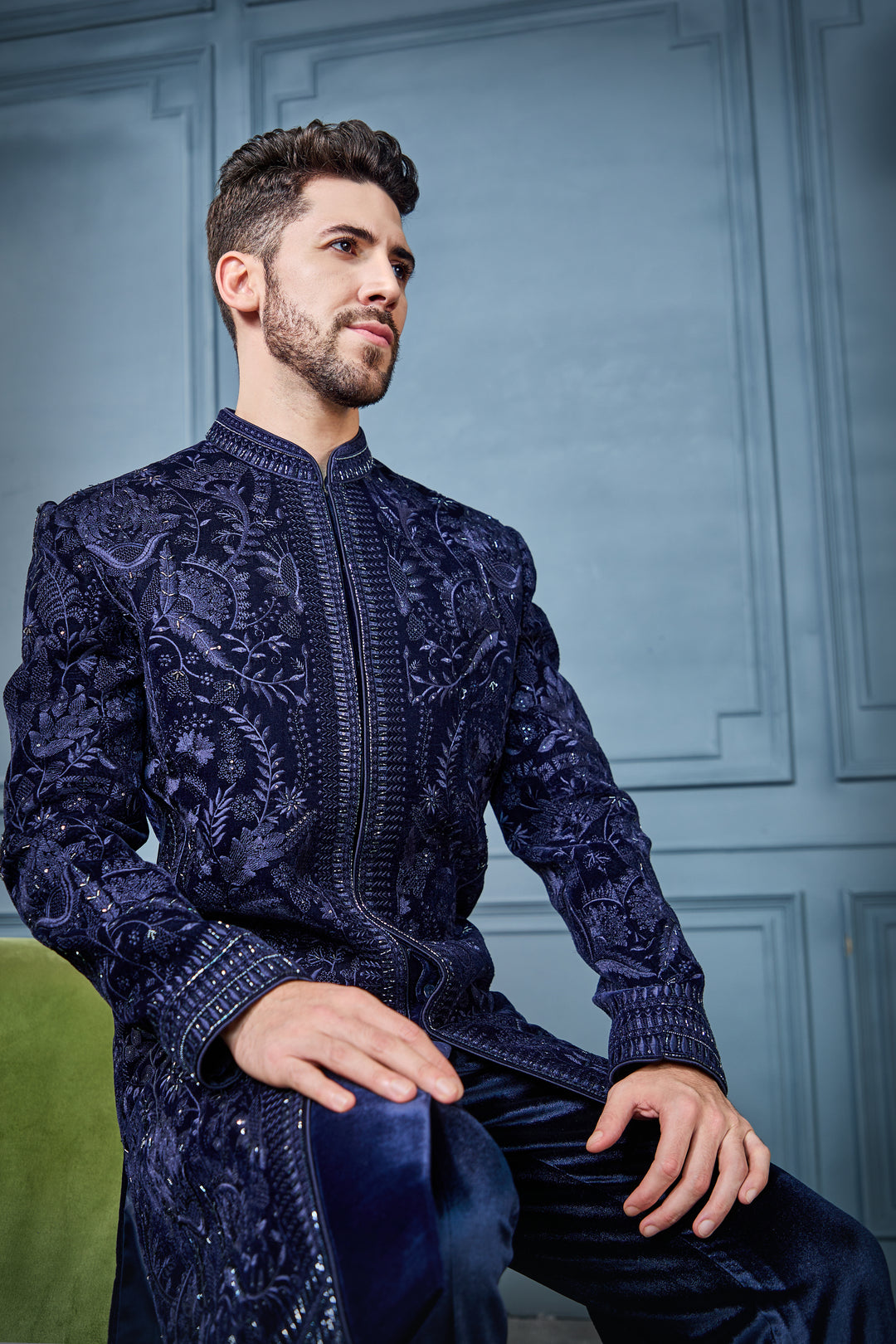 Product Details: This blue velvet long Indo-Western set features self-color threadwork in floral patterns, accentuated with embellishments and salli work. A luxurious blend of velvet texture and intricate floral artistry. ents and salli work. A luxurious fusion of rich velvet and intricate floral detailing.