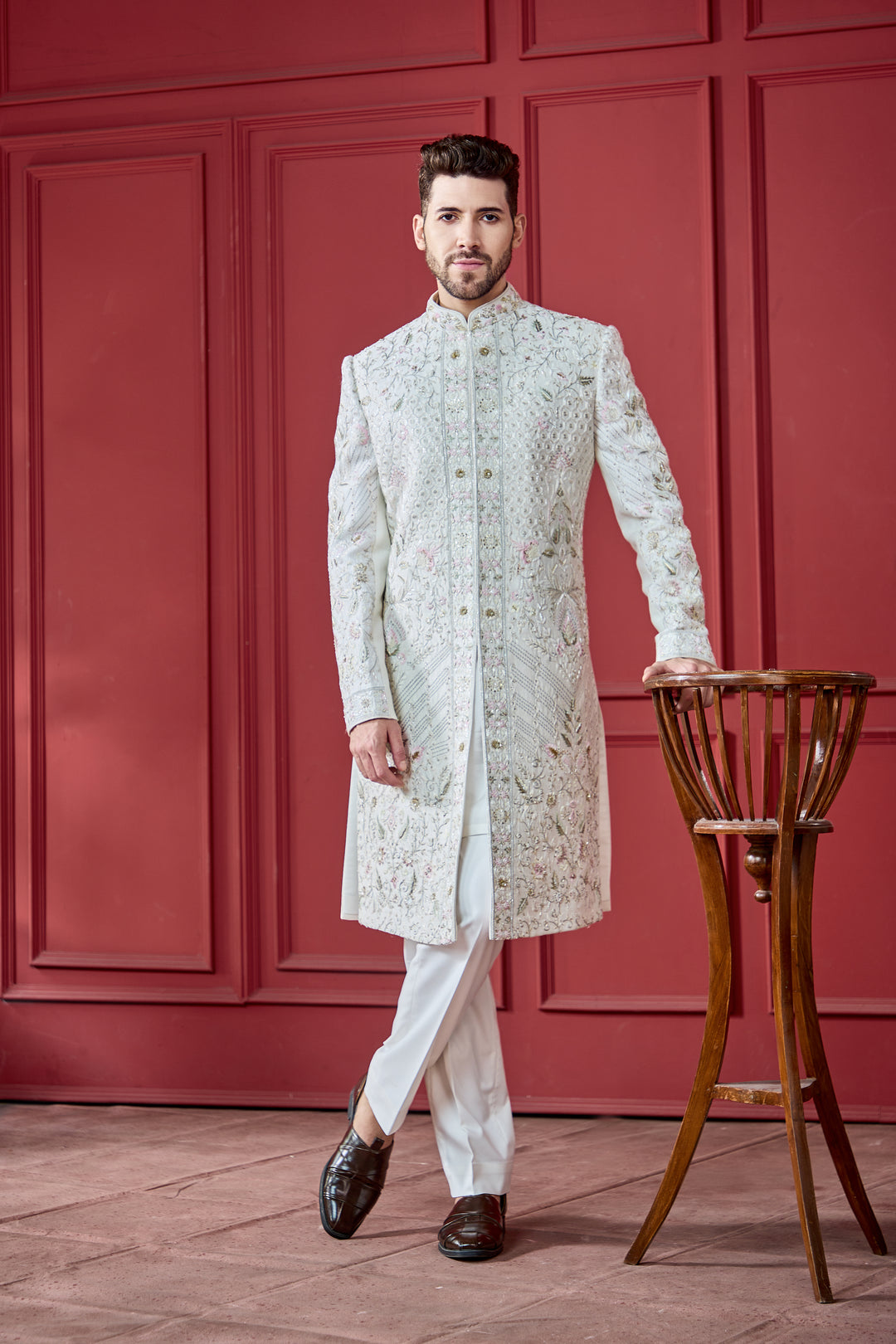 This off-white sherwani combines intricate geometric and floral resham embroidery, elevated with kasab, poth detailing, and delicate touches of pink and light green resham threads. A harmonious blend of tradition and modern elegance, perfect for the groom who values timeless artistry.