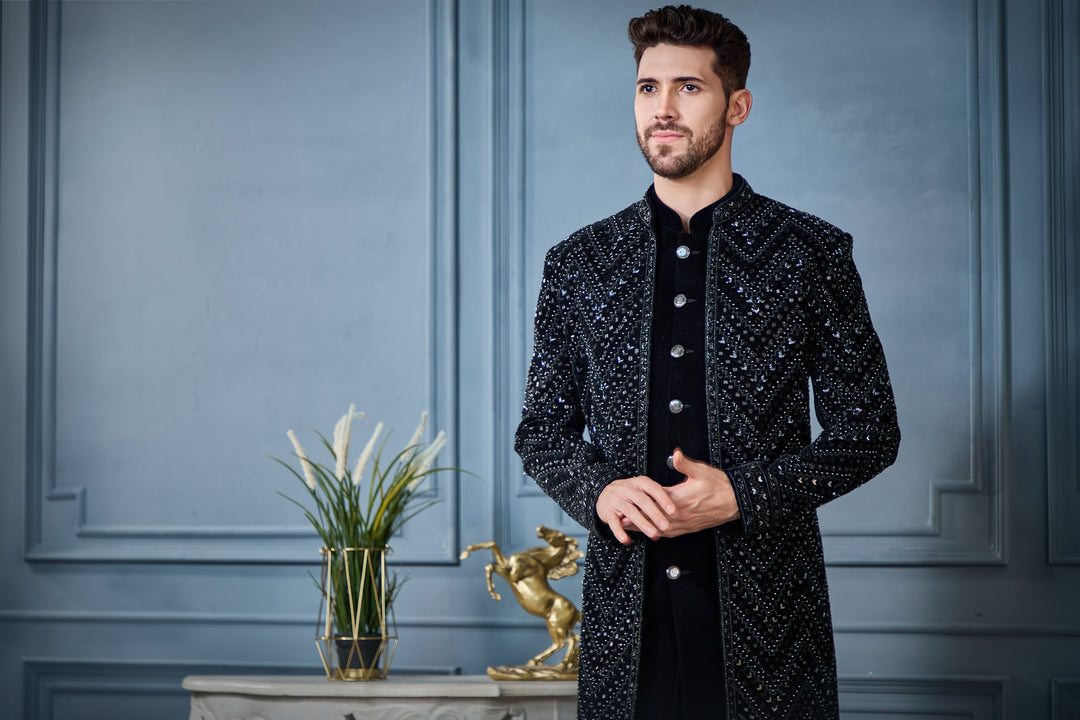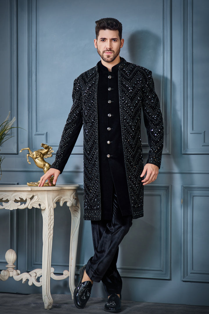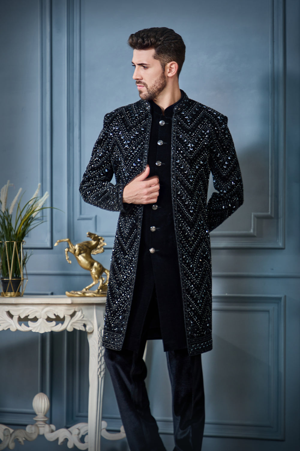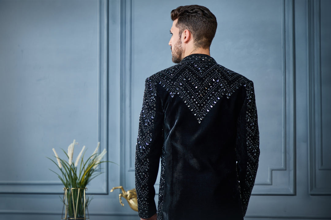 Product Details: This black velvet Indo-Western jacket is adorned with exquisite salli, poth, and cutdana embroidery, enhanced by metallic embellishments that create a stunning 3D effect. Step into the spotlight with an outfit that defines timeless grandeur.