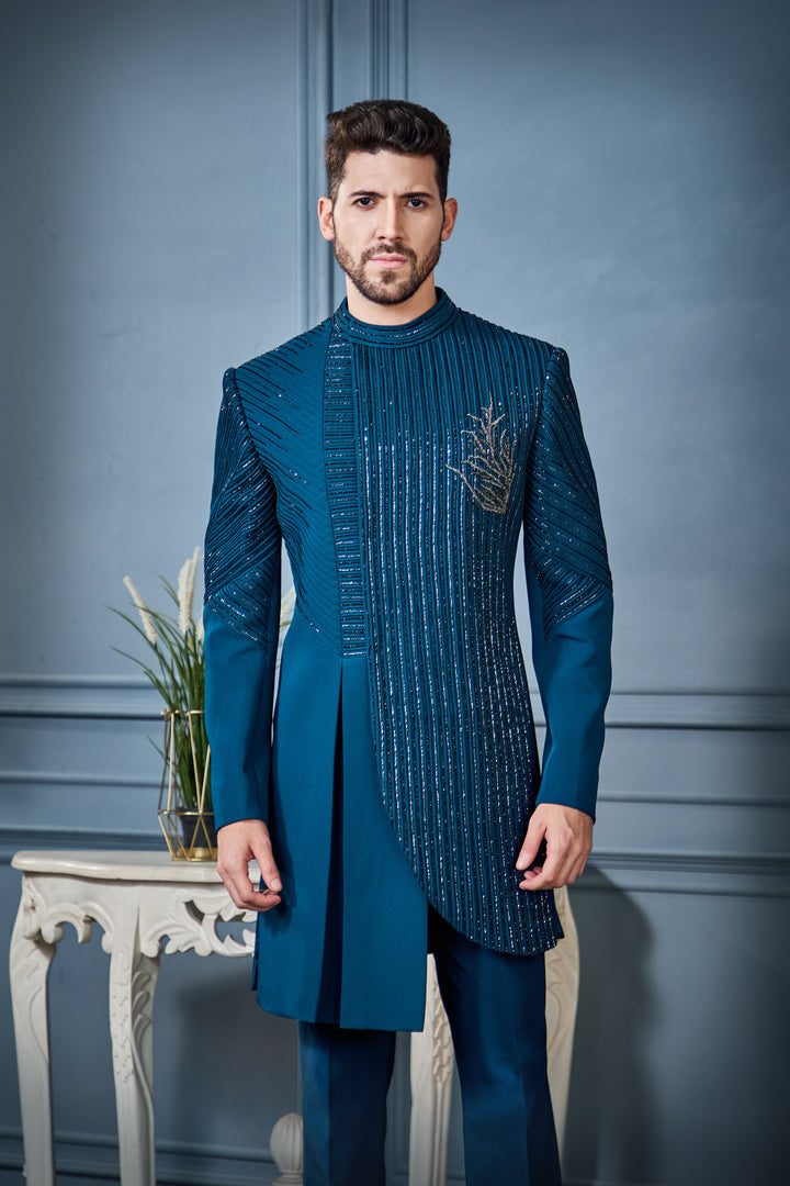 Product Details: This teal blue Indo-Western set features a bold abstract motif crafted with metallic embellishments, complemented by all-over pintex embroidery and intricate black salli work. A striking fusion of modern art and timeless craftsmanship, designed to stand out.