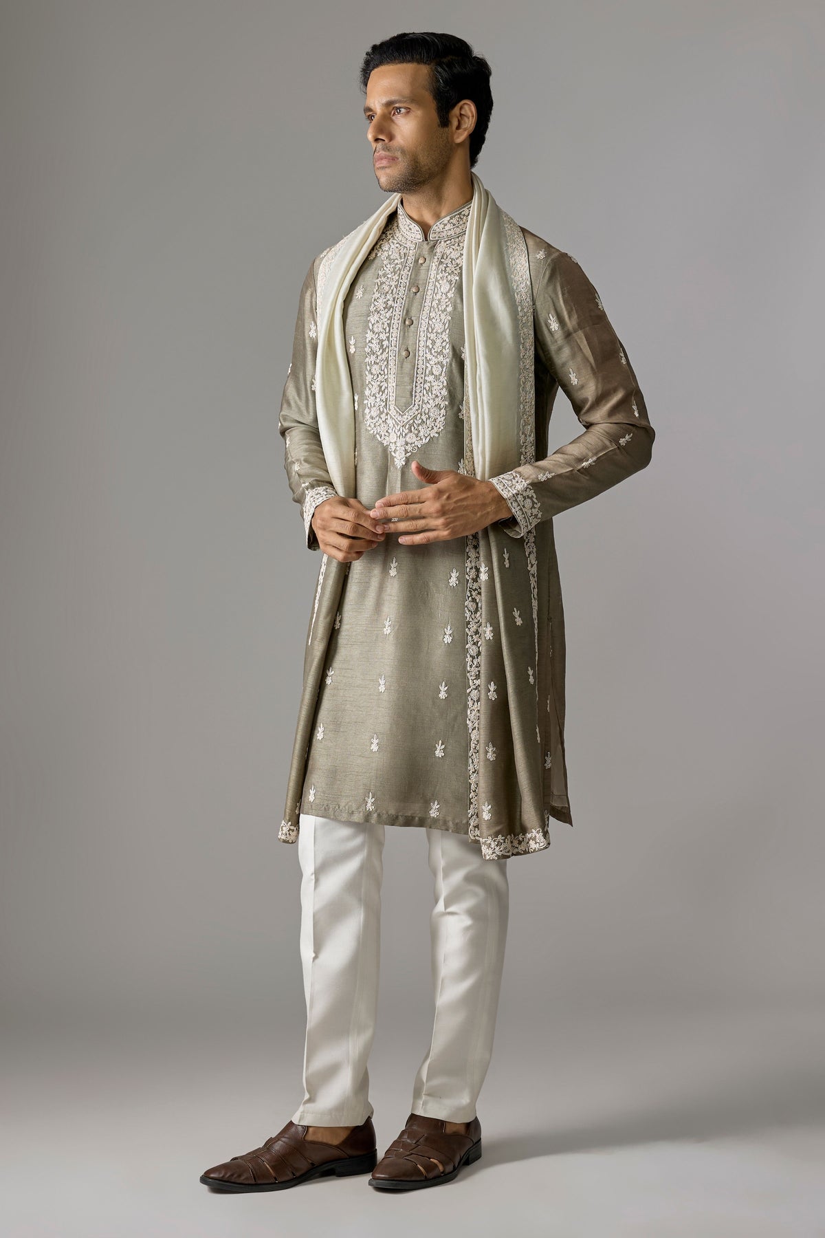 Product Details: Add a touch of understated elegance to your ethnic wardrobe with this Greyish Green Silk Kurta, crafted for refined sophistication. Made from premium silk fabric, it offers a smooth, lustrous finish that feels as good as it looks. The subtle thread embroidery enhances its charm, giving it a graceful traditional appeal that’s perfect for festive celebrations, weddings, or evening gatherings.