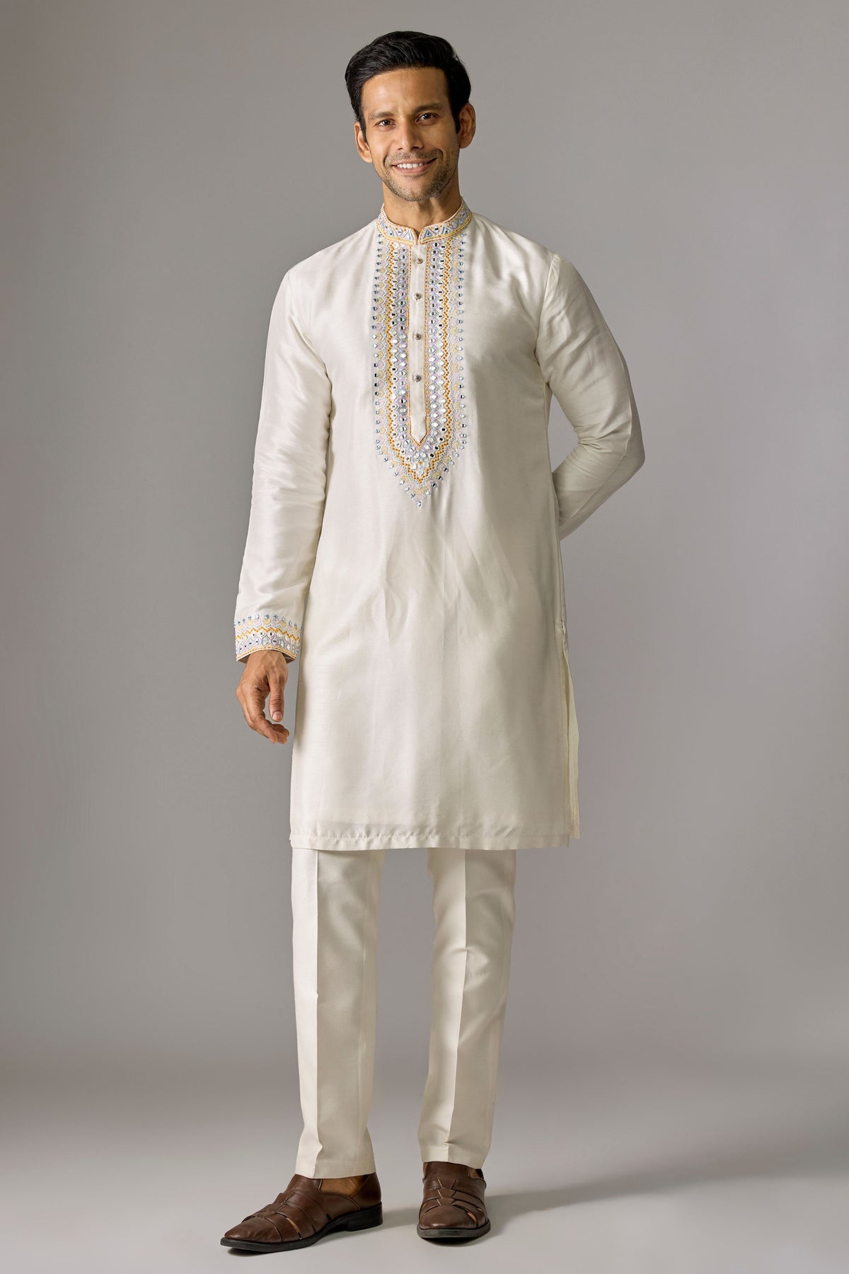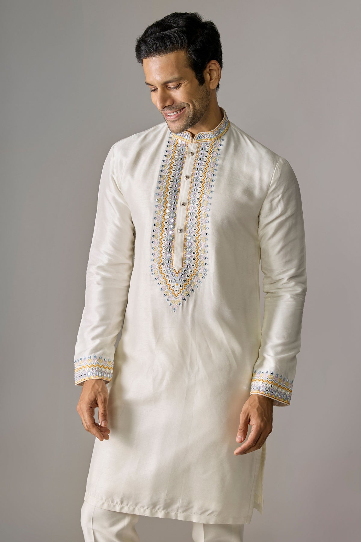 Product Details: This elegant White Silk Fabric Kurta features exquisite hand-painted detailing highlighted with mirror, cutdana, pearl, sequin, and thread work. Crafted from premium fabric, it offers a refined and festive look, perfect for weddings, celebrations, and cultural occasions.