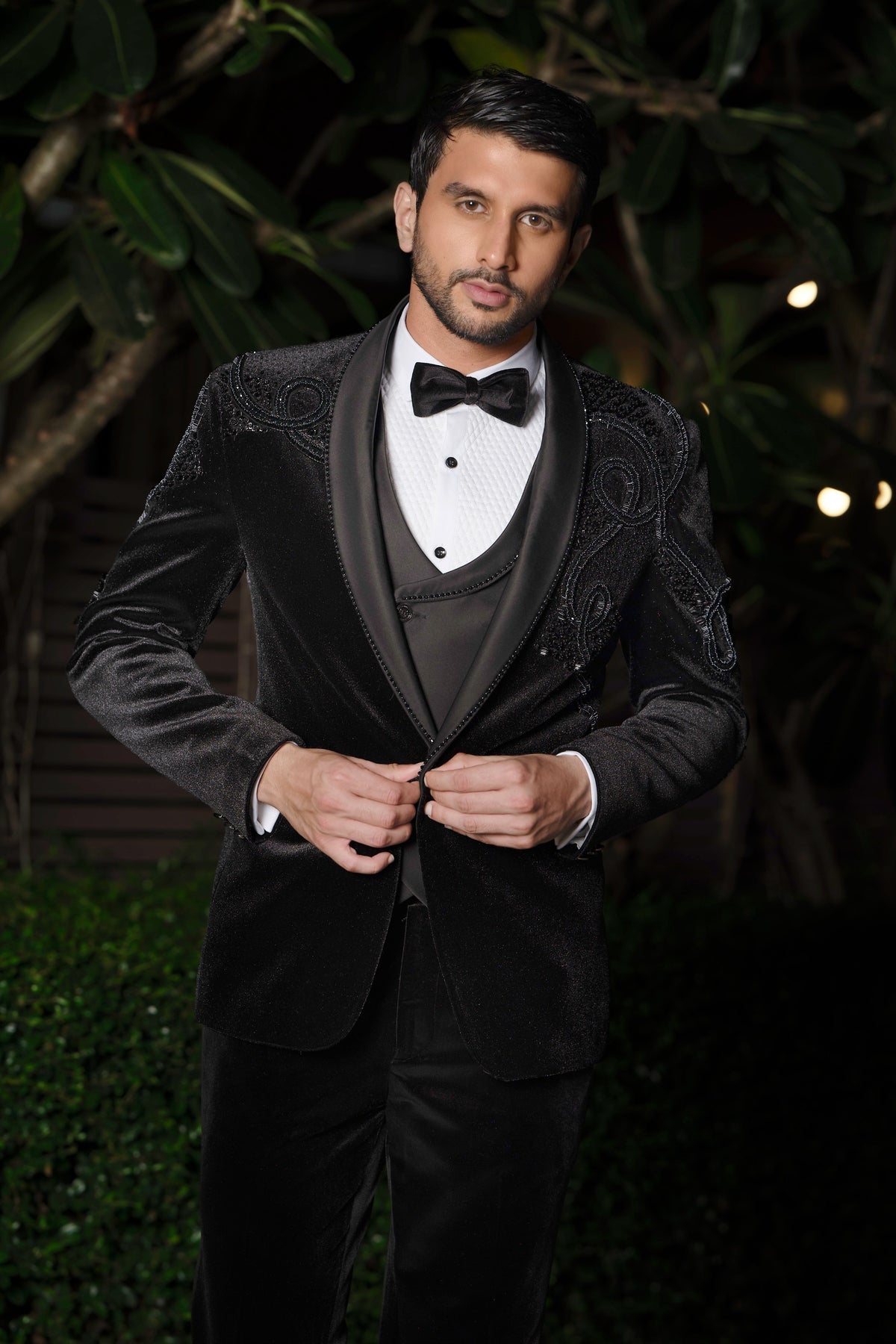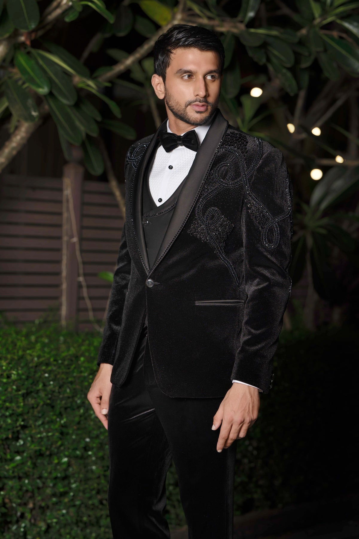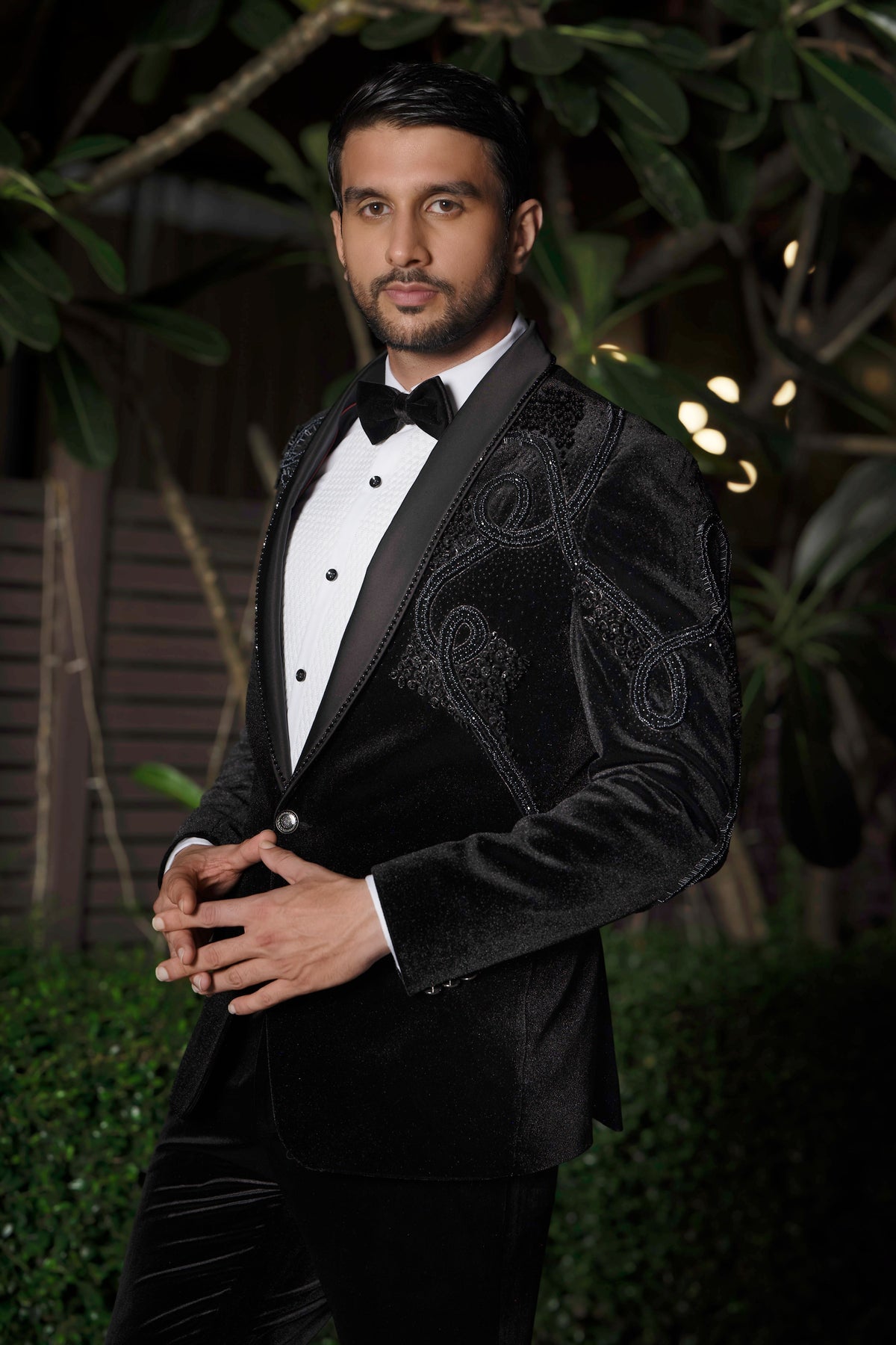 A black shimmer velvet suit featuring 3D abstract embroidery crafted with black pulse and black salli for a sculpted, tonal effect. The deep sheen of the velvet paired with textured detailing creates a bold yet refined evening look, ideal for receptions, cocktails, and luxury men’s occasion wear.