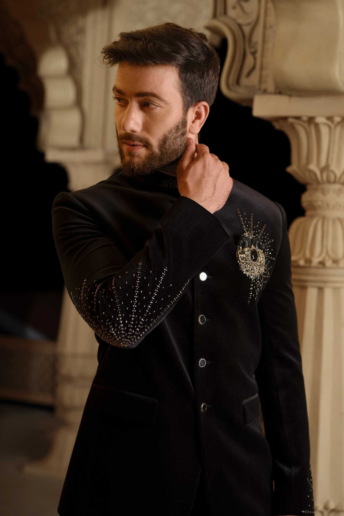 A contemporary black jodhpuri featuring a subtle pin-check texture enhanced with velvet detailing. Metallic embroidery defines the sleeves and accents the structure, while a statement horse brooch adds a cultured, masculine edge. Designed for luxury menswear and wedding occasions, this outfit blends heritage craftsmanship with modern precision.