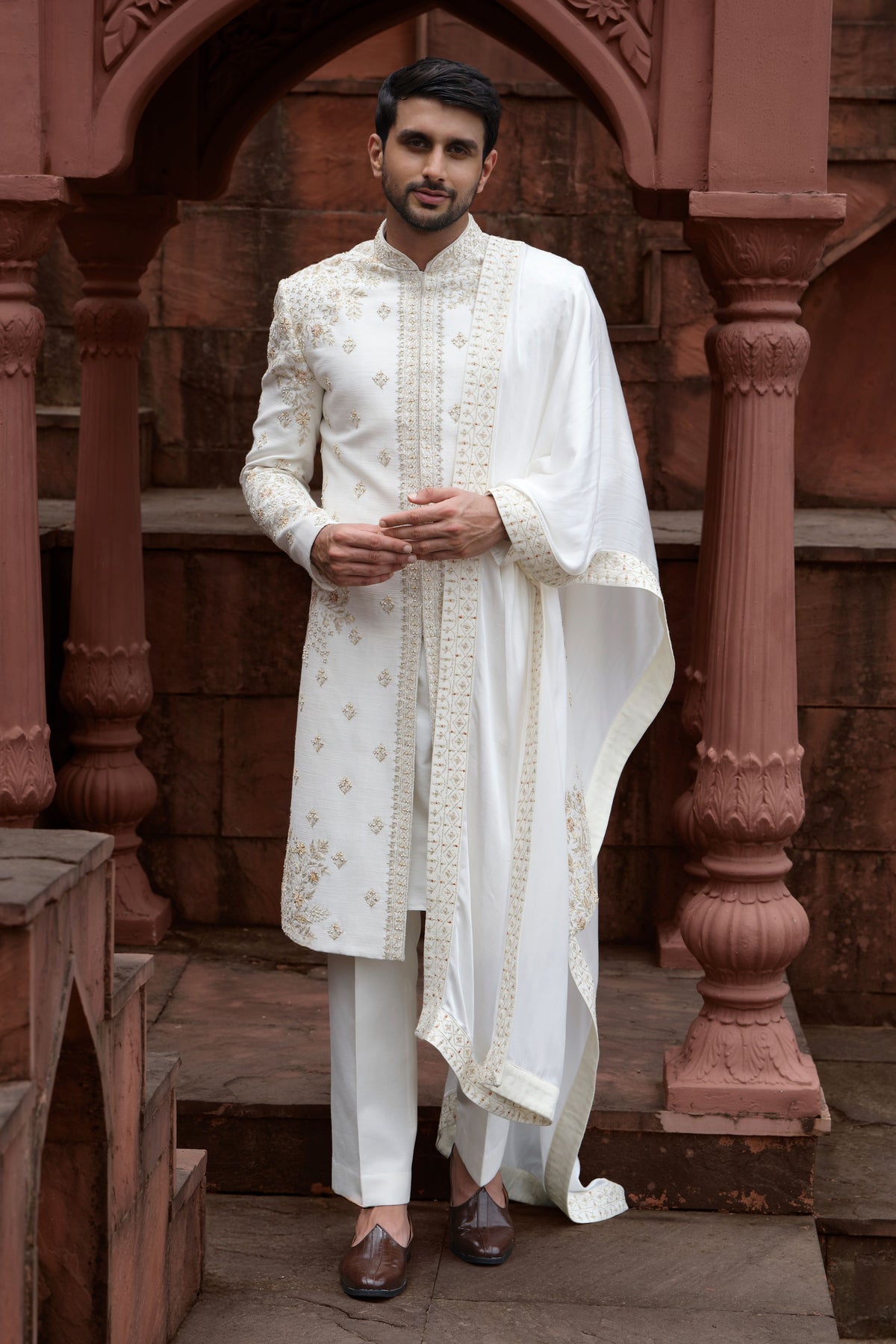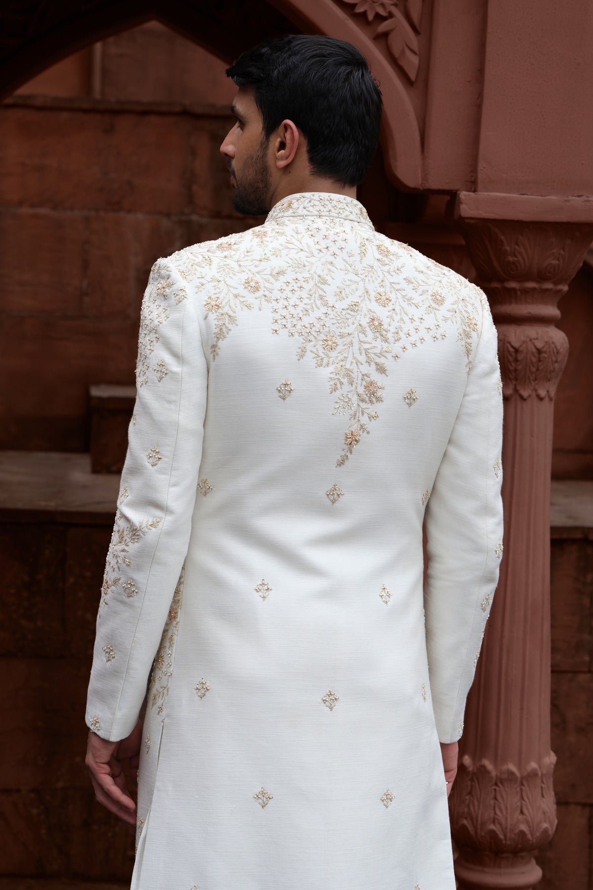 A cream silk Sherwani detailed with refined butti placement embroidery using dori, peta, resham, and zardozi. The balanced surface detailing and clean palette create a sophisticated modern-heritage look suited for groom wear and luxury menswear. Ideal for weddings and festive occasions, this Sherwani blends cultural artistry with contemporary elegance.