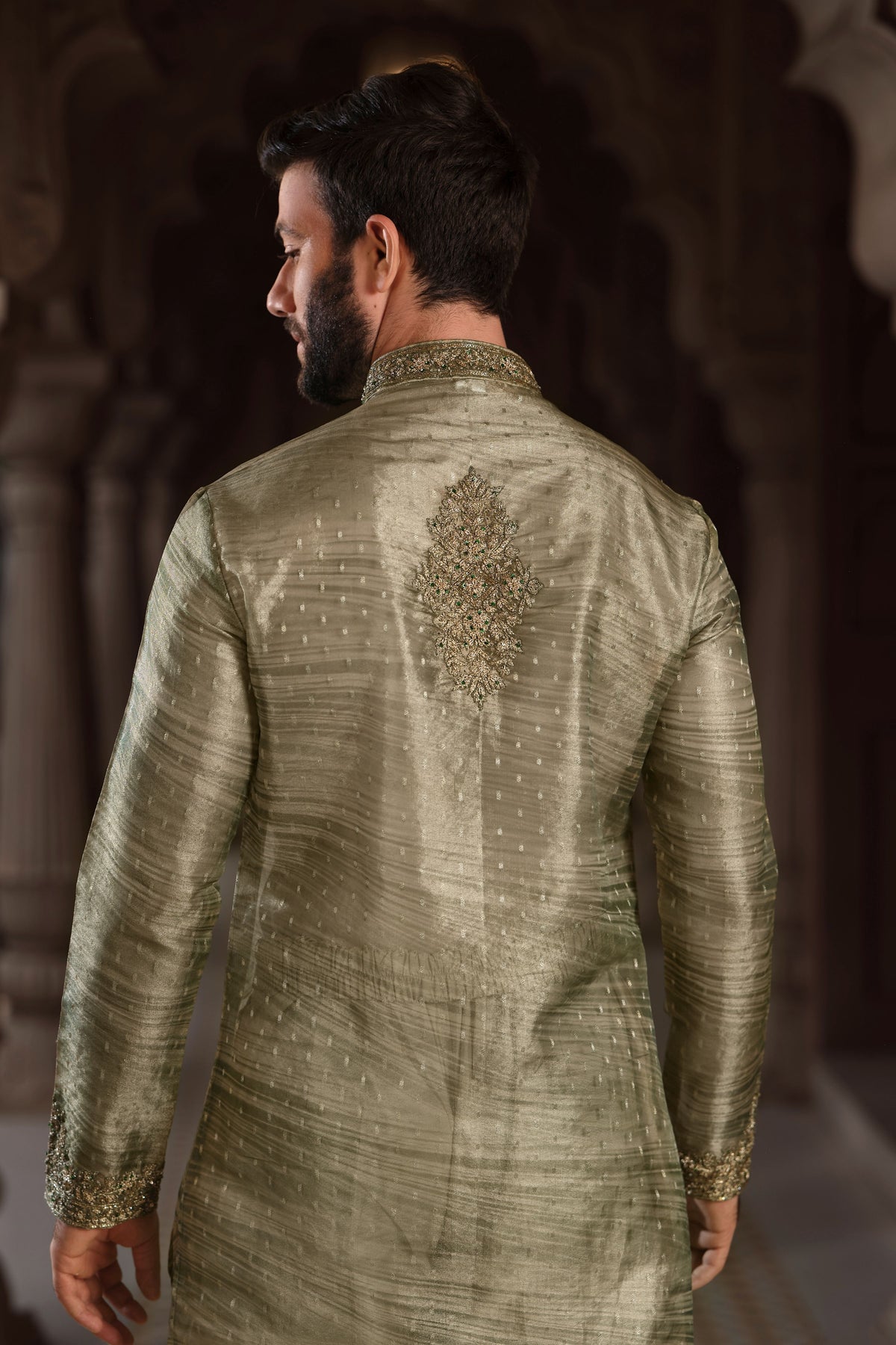 Product Details: Crafted in green banarasi tissue with soft shades of gold and green, this kurta features elegant hand embroidery using kasab, sadi, and cutdana. The textured sheen and refined detailing create a polished festive look, paired perfectly for luxury men’s ethnic wear. Ideal for weddings, celebrations, and elevated traditional dressing.