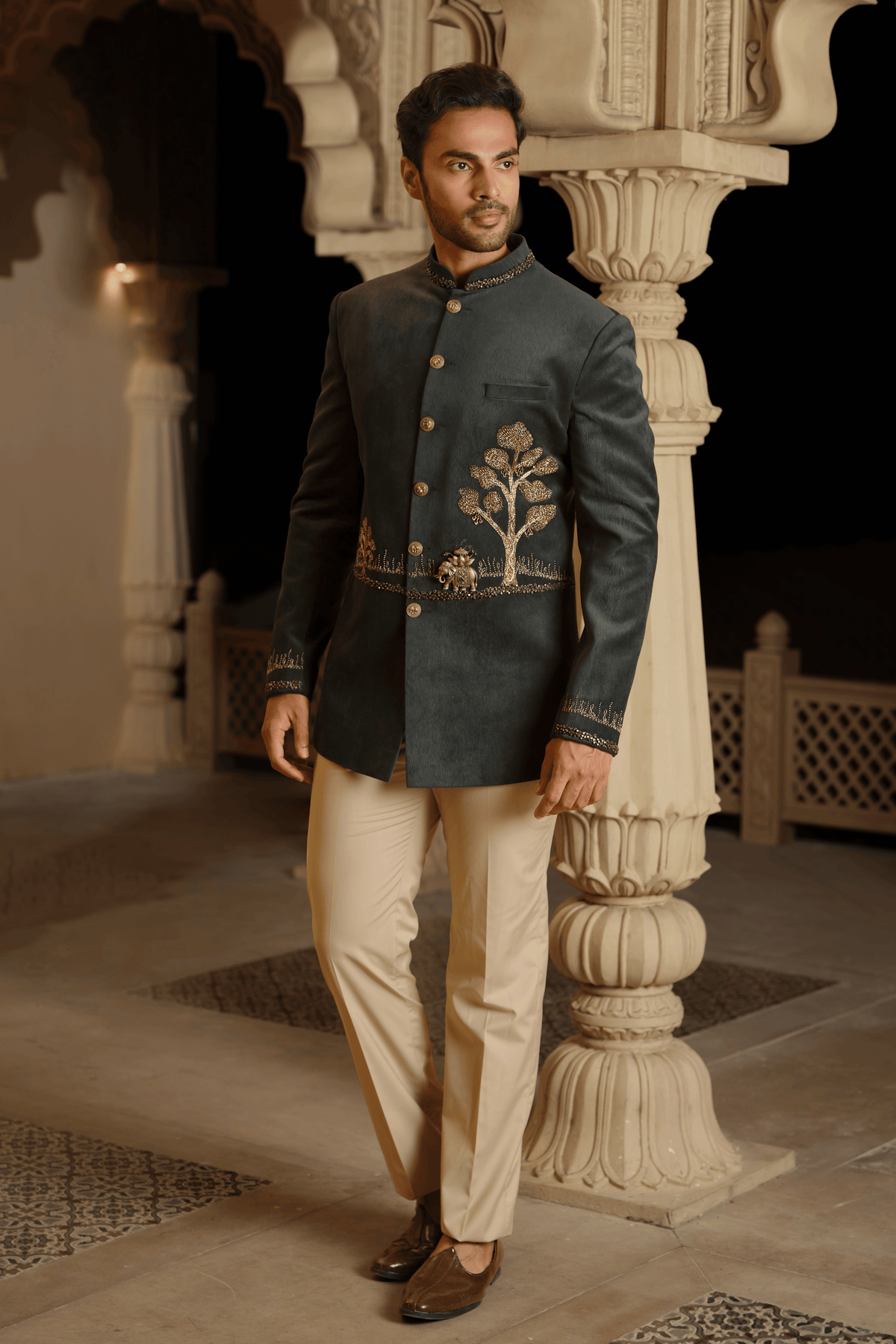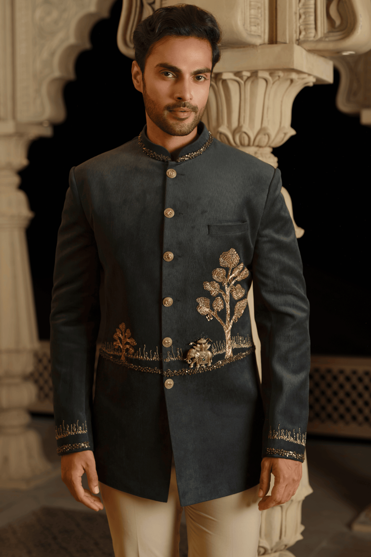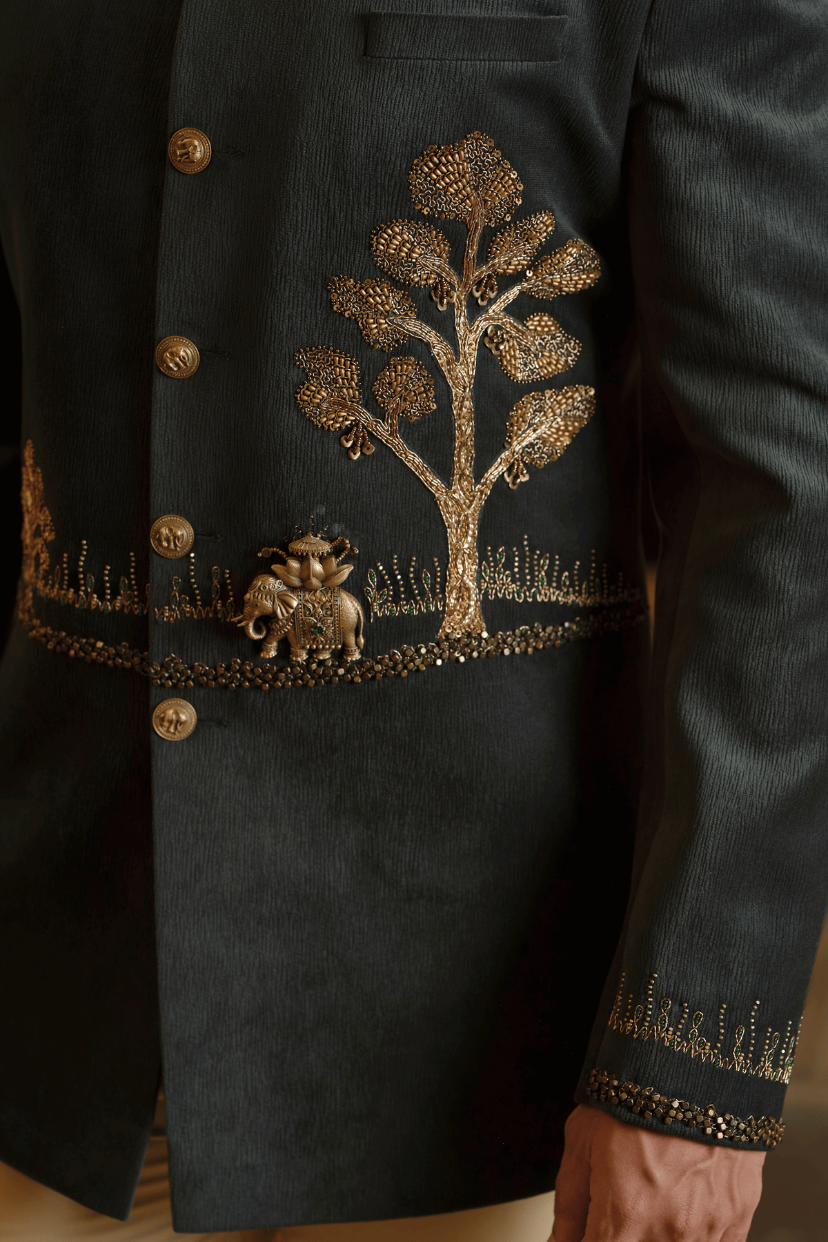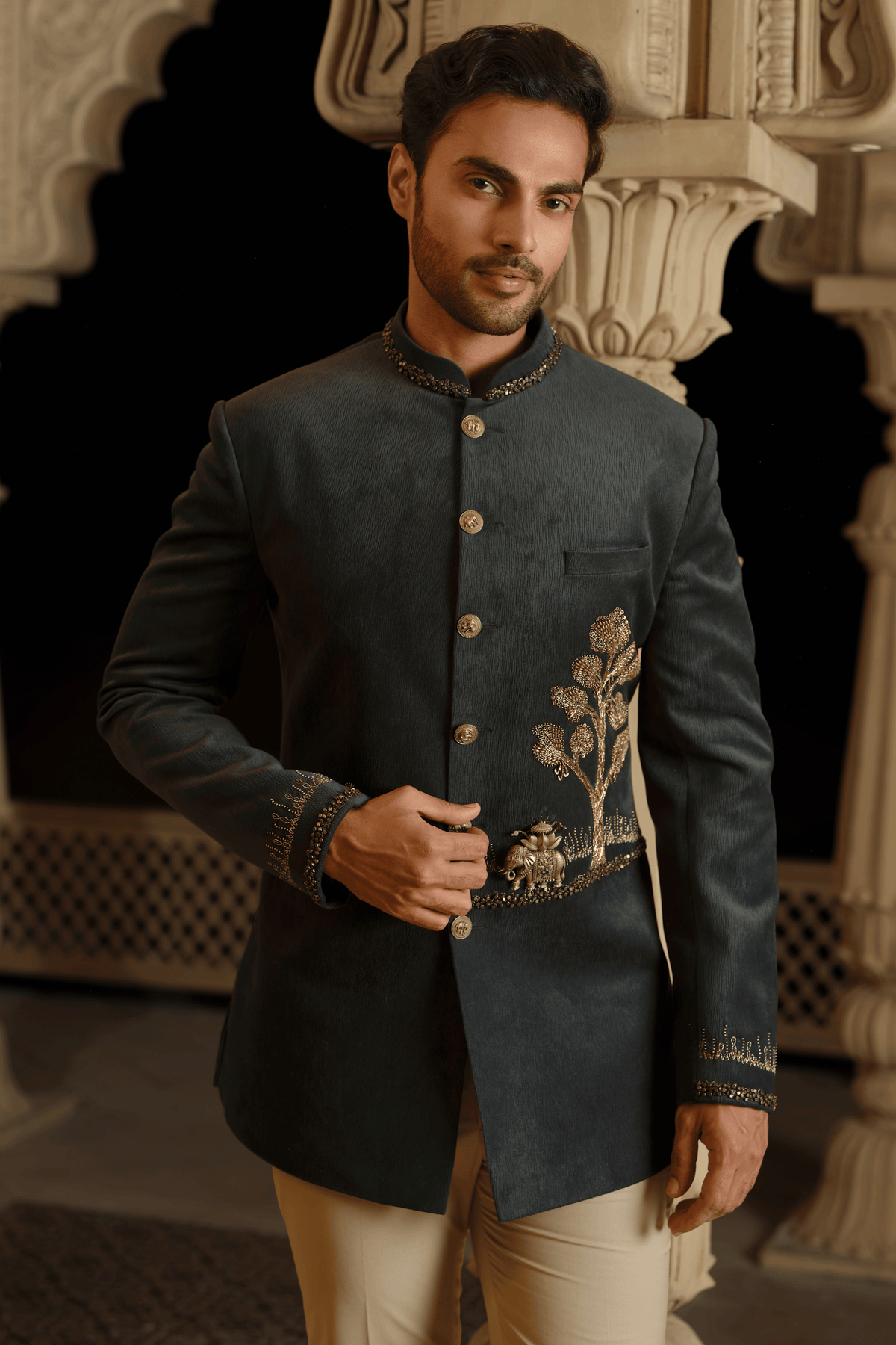 In rich green textured suede, this Jodhpuri brings a refined blend of structure and cultural artistry. The elephant-in-forest narrative is highlighted through a statement elephant brooch and detailed embroidery, creating a strong yet sophisticated appeal. Designed for men seeking luxury menswear with heritage cues, it’s ideal for weddings, receptions, and premium festive occasions.