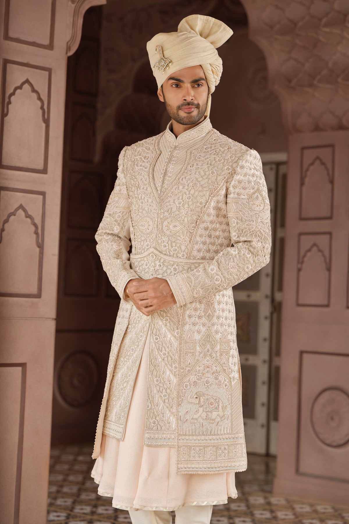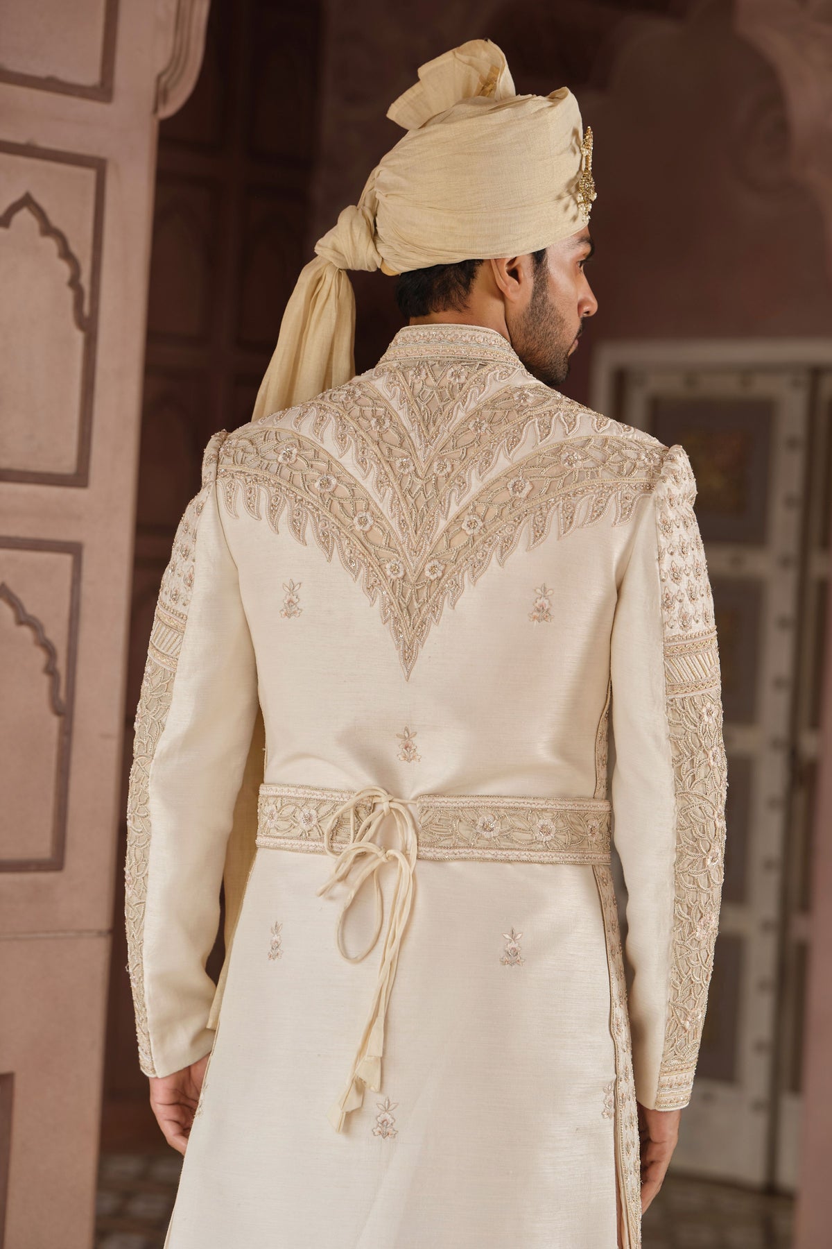 A light gold silk Sherwani featuring an intricately crafted yoke with cutwork detailing, enhanced by zardozi and resham motifs. The refined handwork adds depth and definition while maintaining a clean, contemporary silhouette. Designed for luxury menswear and groom wear, this Sherwani brings together modern elegance and heritage craftsmanship for weddings and grand celebrations.