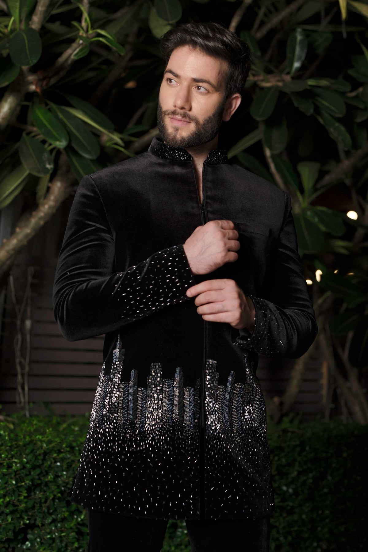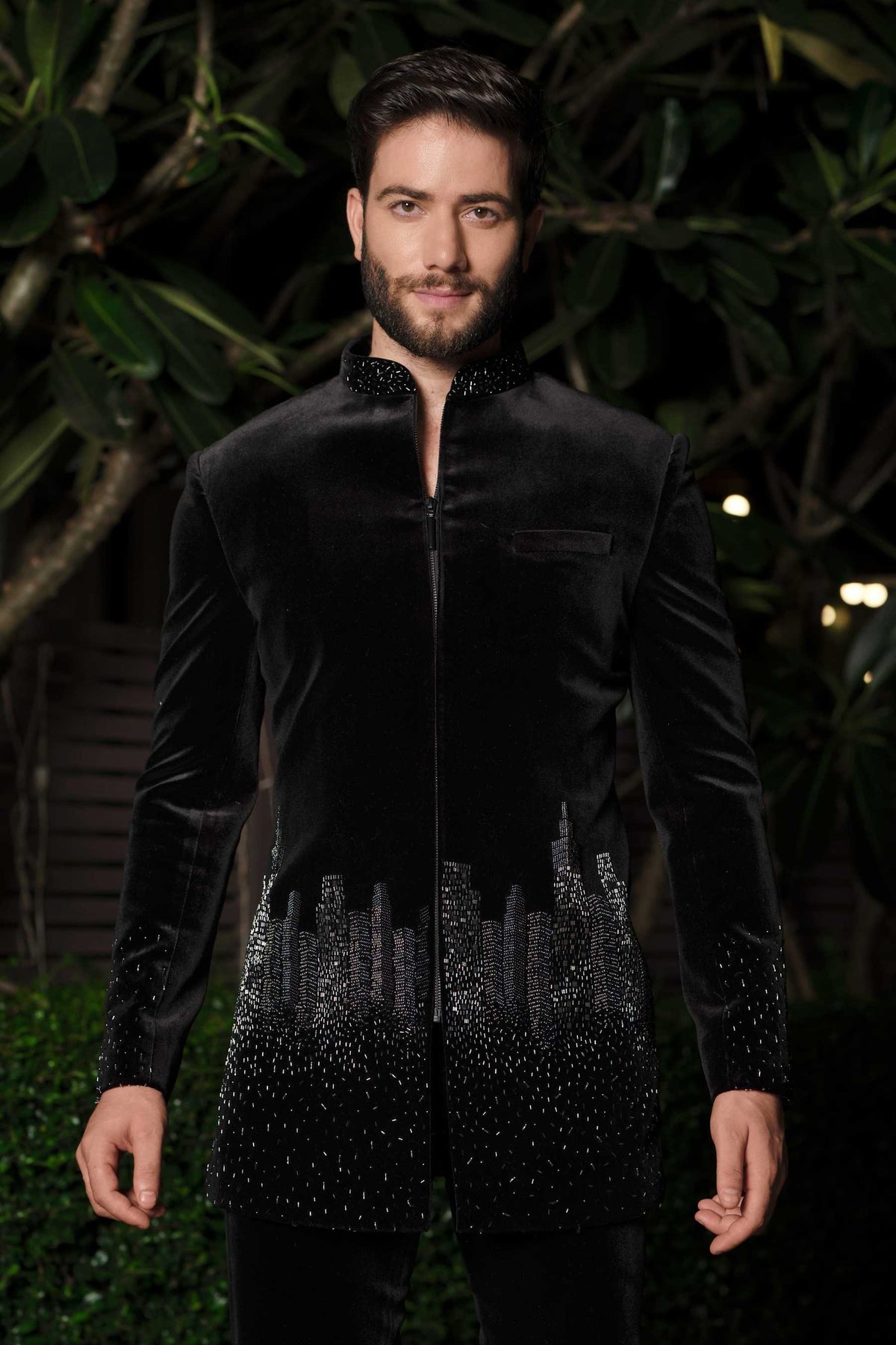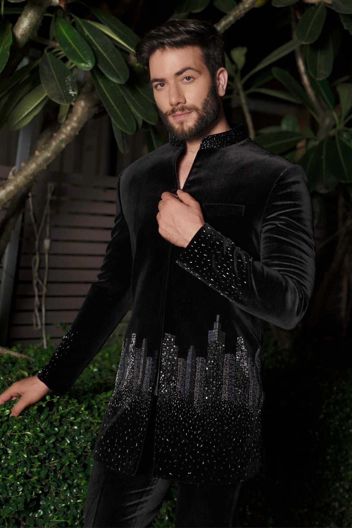 A black velvet Indo-western featuring a zipper jacket inspired by the city night skyline, embellished with peta, salli, and cutdana. The textured shimmer and urban-inspired detailing create a bold, contemporary look ideal for luxury menswear and wedding celebrations. Modern, masculine, and distinctive, this outfit blends metropolitan storytelling with refined craftsmanship.