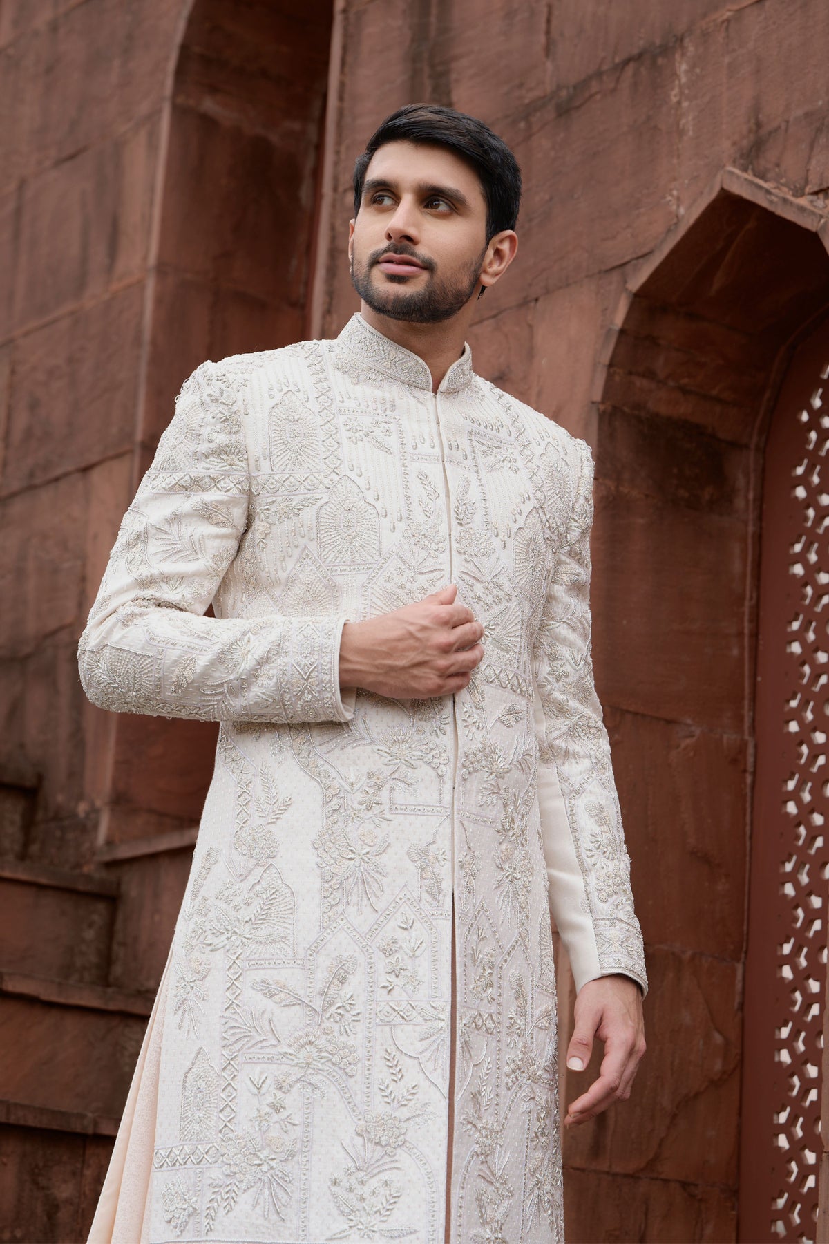 A sophisticated peach silk Sherwani crafted with pure handwork using kora, sadi, kasab, and resham. The soft hue meets detailed artistry, creating a refined balance of heritage craft and contemporary luxury. Ideal for groom wear and premium men’s wedding attire, this Sherwani delivers a polished, modern-heritage aesthetic.