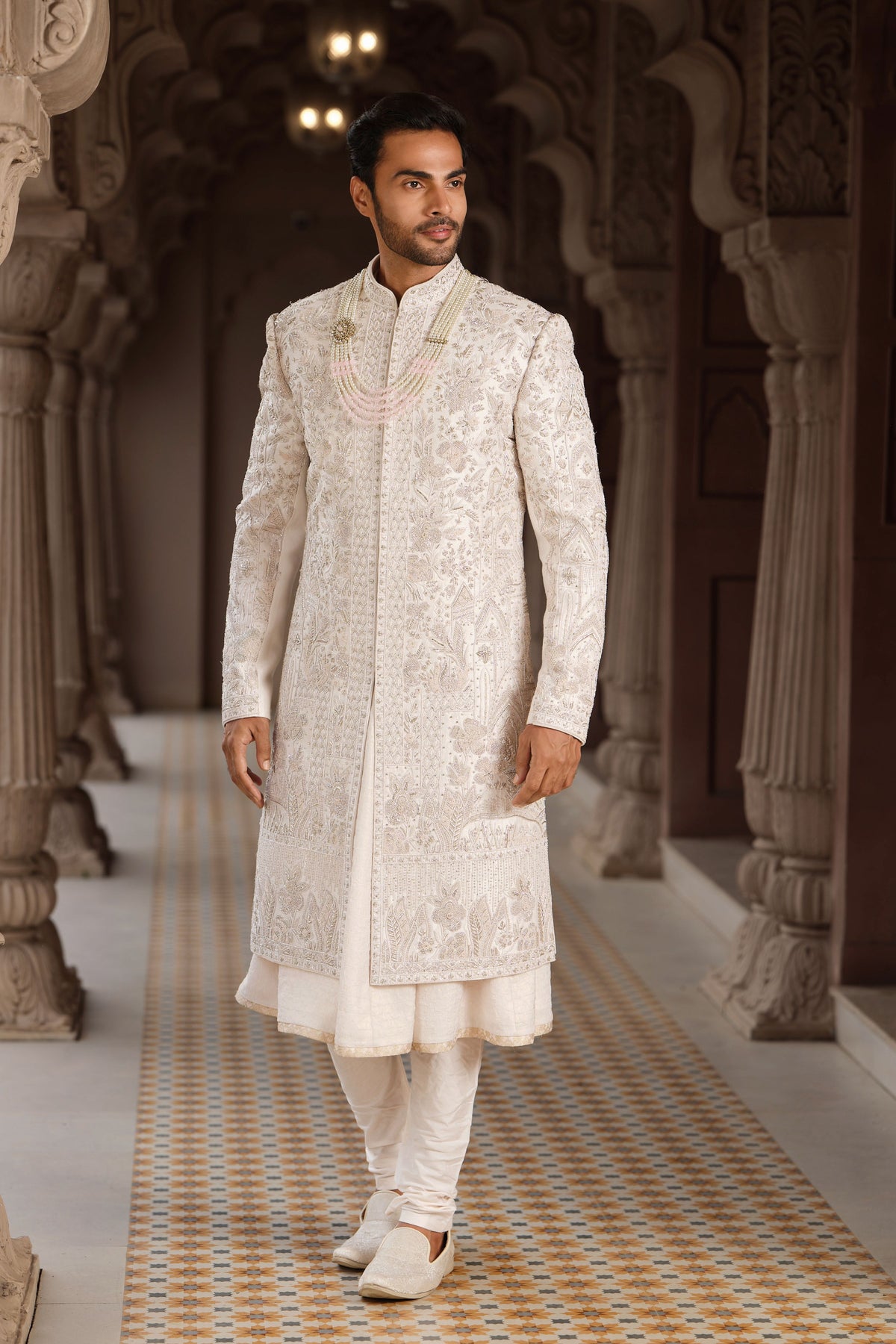 Crafted in powder pink silk, this sherwani features pure hand embroidery with kora, sadi, resham, and cutdana detailing. Designed for luxury menswear enthusiasts, it balances refined heritage with a modern silhouette, making it ideal as a sherwani for groom or wedding wear. A sophisticated statement that highlights ReChannel’s contemporary take on Indian craft.