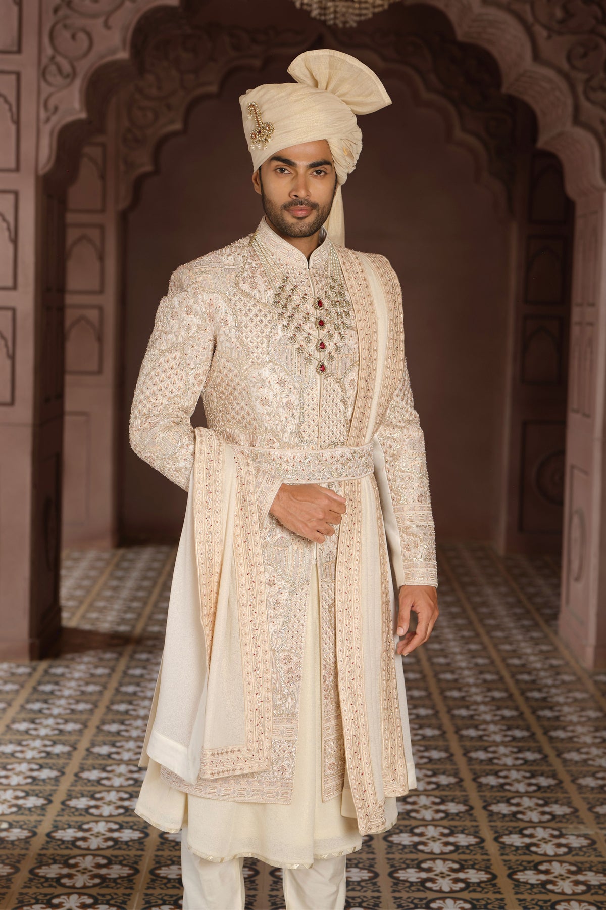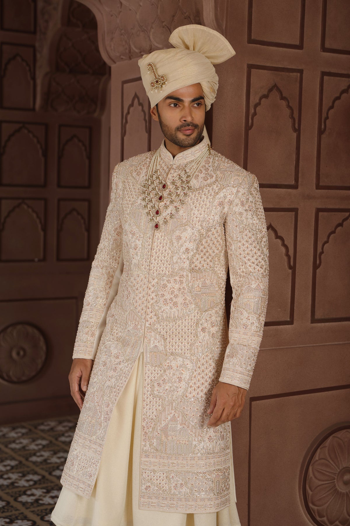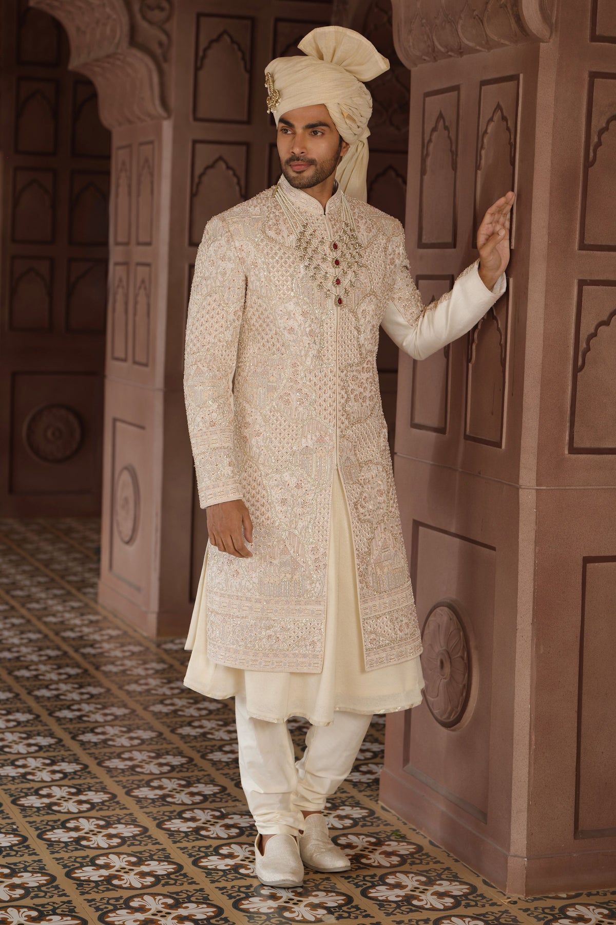 A butter-cream silk Sherwani crafted with intricate pita work and a samatrix-inspired motif layout. The clean tone highlights the refined surface detailing, creating a sophisticated blend of heritage craft and modern luxury. Ideal for groom wear and premium wedding celebrations, this Sherwani offers a polished, contemporary presence with artisanal depth.