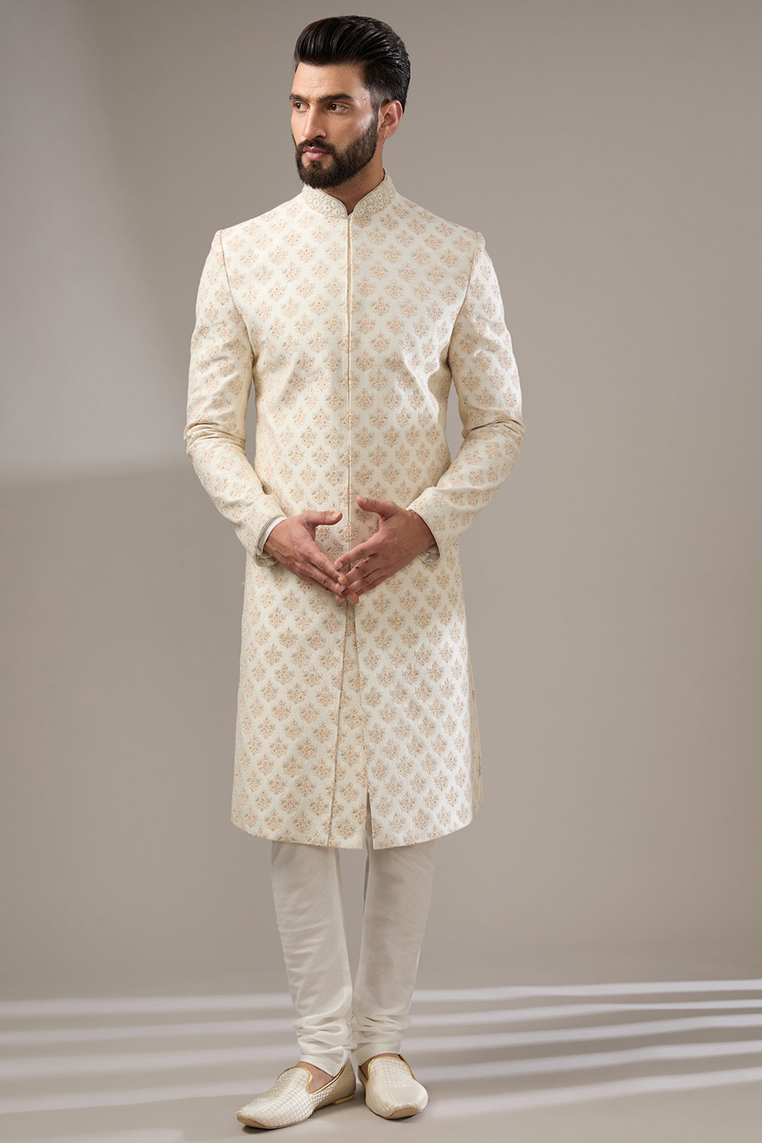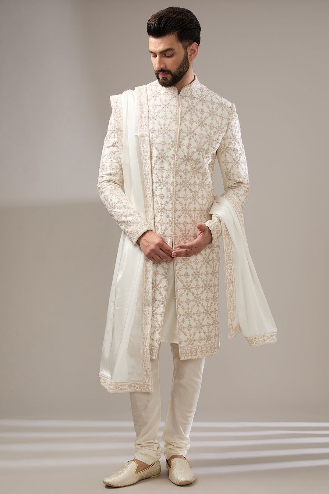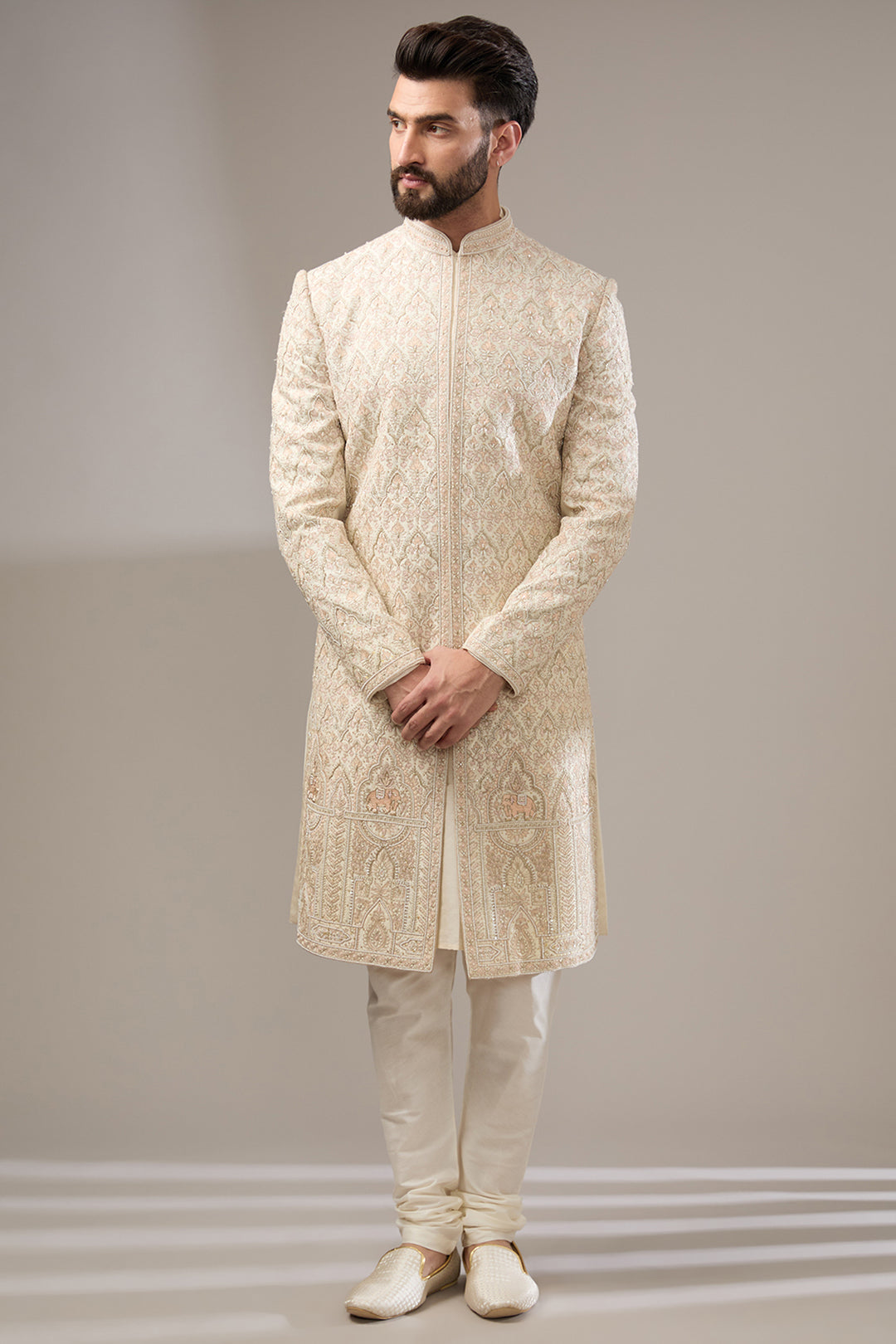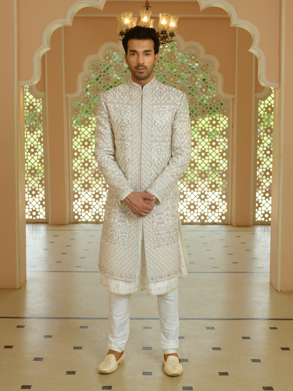 Hand-Embroidered Sherwanis features intricate hand embroidery, combining traditional patterns with contemporary designs. These luxurious pieces are perfect for the groom who wants to make a regal statement on his wedding day. Traditional Zardosi Sherwanis with elaborate gold and silver thread work, adding a touch of grace to your wedding attire.Velvet Sherwanis add touch of royal elegance, ReChannel’s velvet sherwanis are an ideal choice for Grand winter wedding. Traditional silk sherwani give soft & royal look. Pastel sherwani for men are trending right now & most appreciated sherwanis by our groom & groomsmen. The plush fabric combined with detailed embroidery creates a majestic look that is perfect for the grand occasion. Style Classic sherwani with Safa, mojris, juttis, Kamarbandh & malas. For Wedding theme sherwani or Customization book our appointment now!
