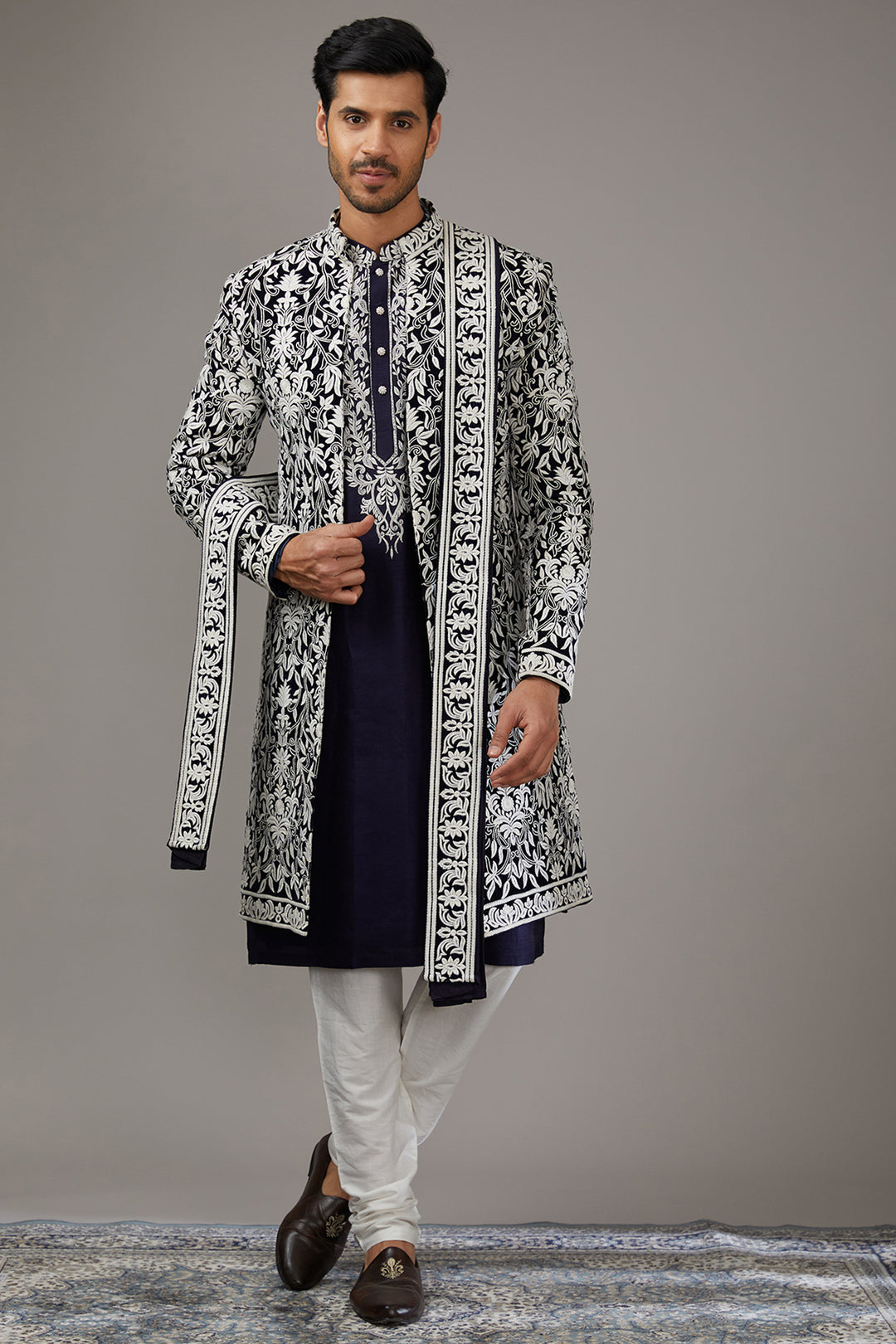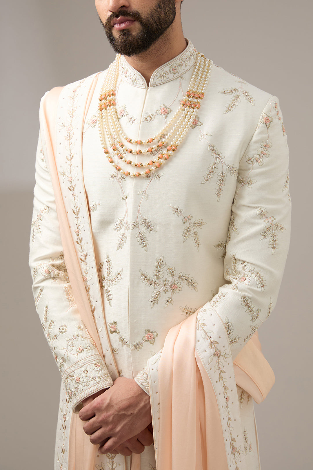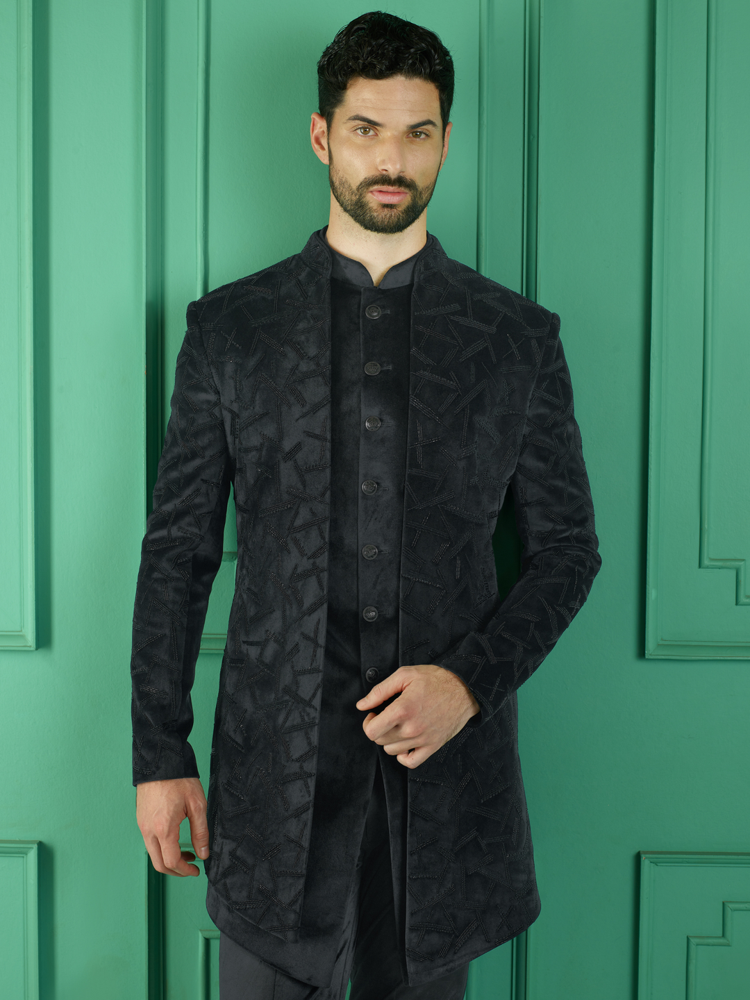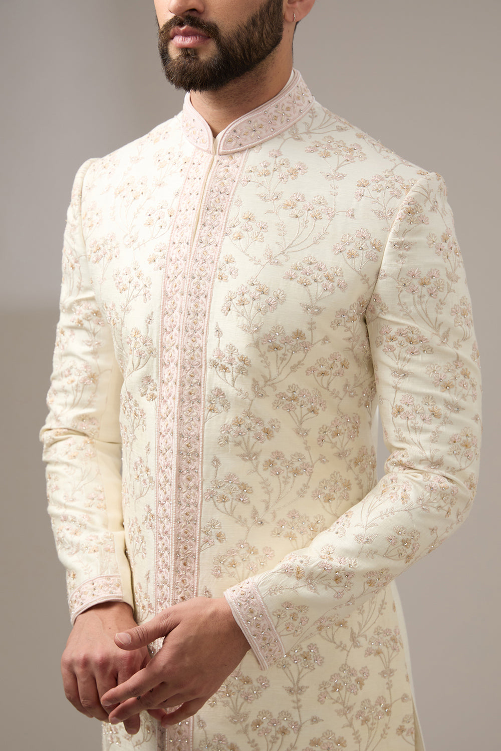 Hand-Embroidered Sherwanis features intricate hand embroidery, combining traditional patterns with contemporary designs. These luxurious pieces are perfect for the groom who wants to make a regal statement on his wedding day. Traditional Zardosi Sherwanis with elaborate gold and silver thread work, adding a touch of grace to your wedding attire.Velvet Sherwanis add touch of royal elegance, ReChannel’s velvet sherwanis are an ideal choice for Grand winter wedding. Traditional silk sherwani give soft & royal look. Pastel sherwani for men are trending right now & most appreciated sherwanis by our groom & groomsmen. The plush fabric combined with detailed embroidery creates a majestic look that is perfect for the grand occasion. Style Classic sherwani with Safa, mojris, juttis, Kamarbandh & malas. For Wedding theme sherwani or Customization book our appointment now!