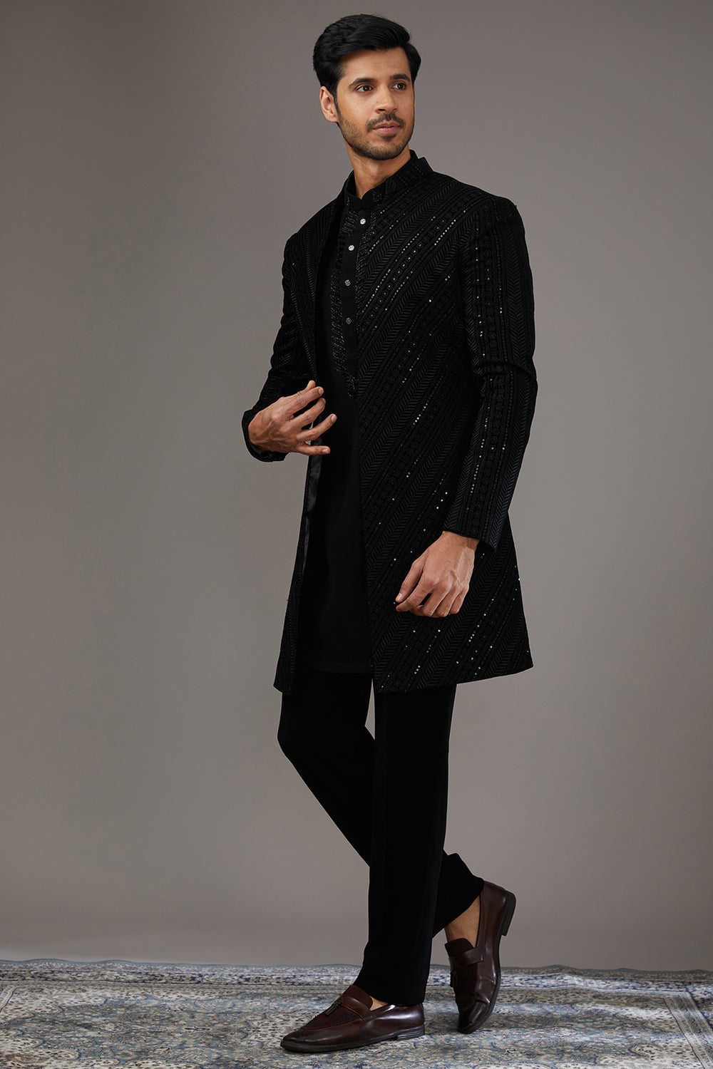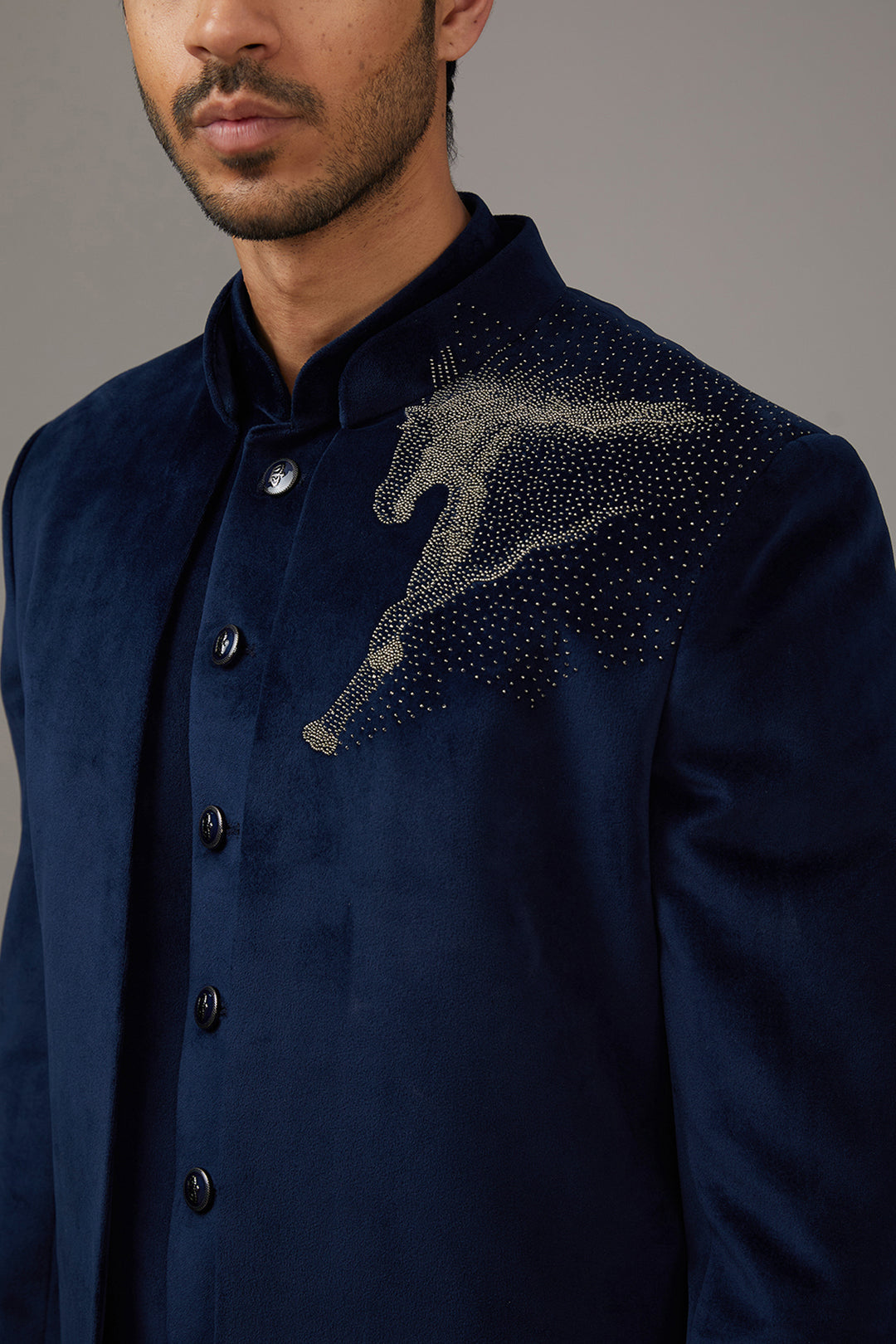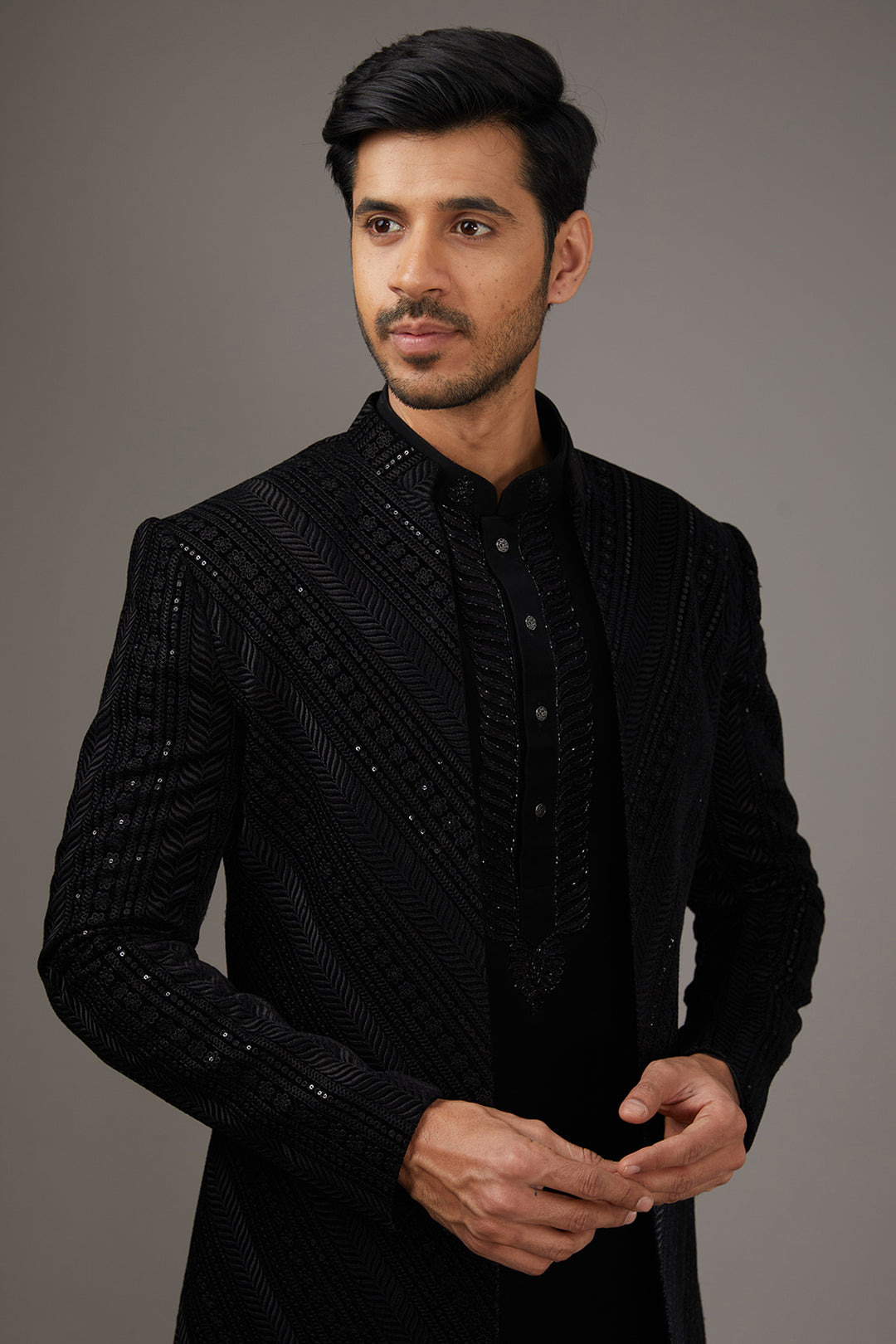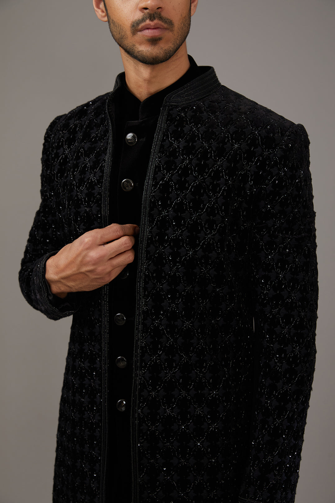 Hand-Embroidered Sherwanis features intricate hand embroidery, combining traditional patterns with contemporary designs. These luxurious pieces are perfect for the groom who wants to make a regal statement on his wedding day. Traditional Zardosi Sherwanis with elaborate gold and silver thread work, adding a touch of grace to your wedding attire.Velvet Sherwanis add touch of royal elegance, ReChannel’s velvet sherwanis are an ideal choice for Grand winter wedding. Traditional silk sherwani give soft & royal look. Pastel sherwani for men are trending right now & most appreciated sherwanis by our groom & groomsmen. The plush fabric combined with detailed embroidery creates a majestic look that is perfect for the grand occasion. Style Classic sherwani with Safa, mojris, juttis, Kamarbandh & malas. For Wedding theme sherwani or Customization book our appointment now!