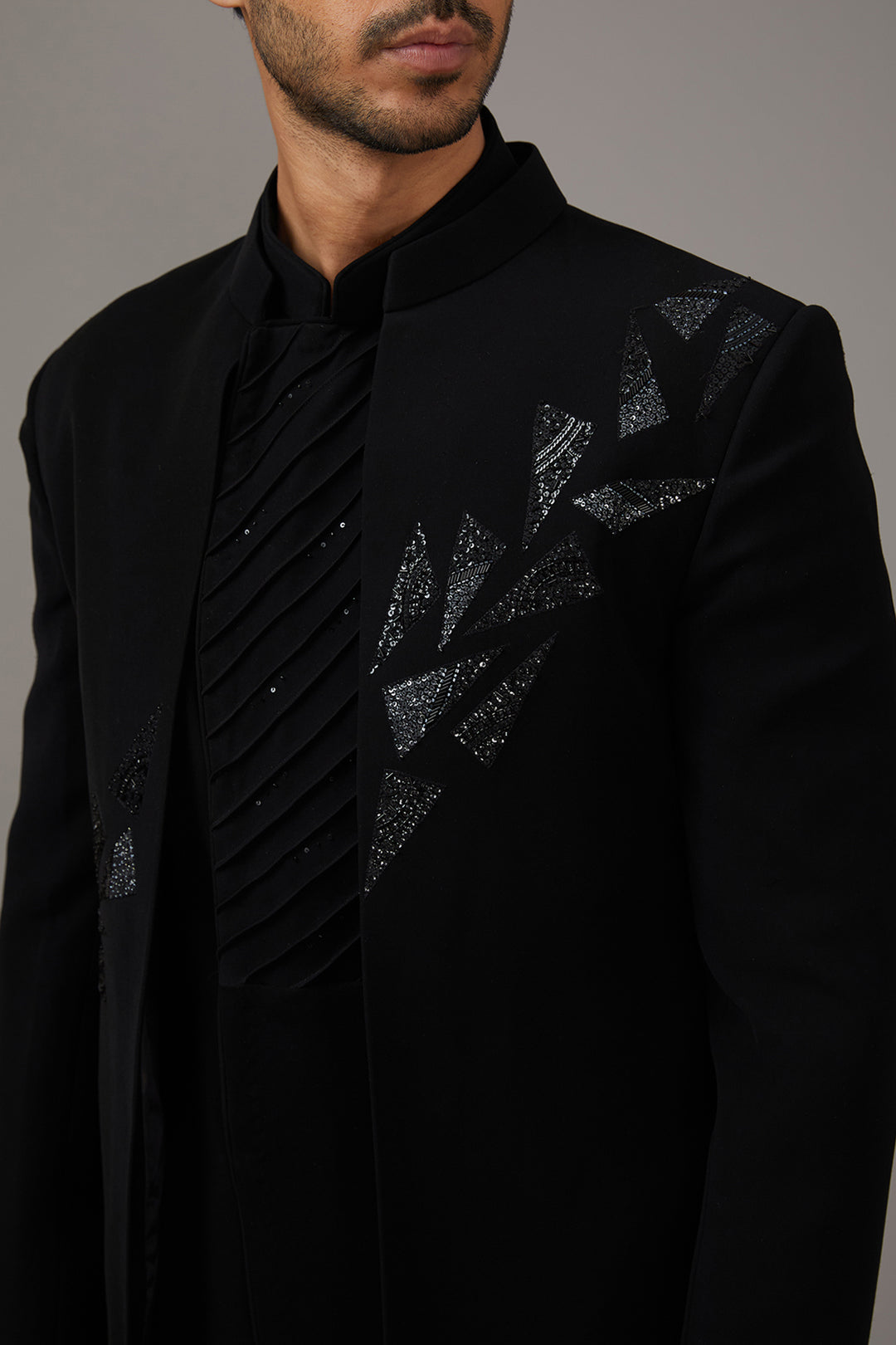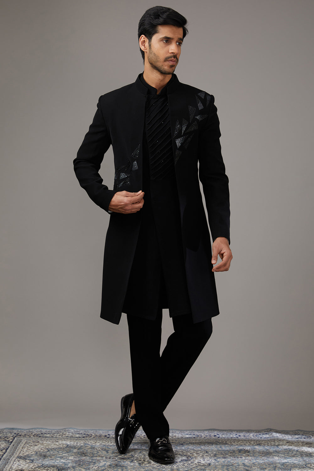 ReChannel’s classic black tuxedo sets are perfect for the groom who prefers a modern glam look. These modern tuxedos are tailored to perfection, ensuring a sleek and elegant appearance. Embellished Tuxedo Jackets are for a unique twist on the traditional tuxedo, our Long jackets and open jacket offer a stylish glam look. These unique suit pieces feature subtle shimmer & embroidery that adds a touch of flair to the classic tuxedo look. ReChannel’s velvet tuxedo sets with brooches are designed for the groom who wants to make a bold statement. The luxurious fabric and intricate detailing make classic tuxedos a standout choice for any wedding or pre-wedding event. For Tuxedos/Suits Theme party or Customization book our appointment now!