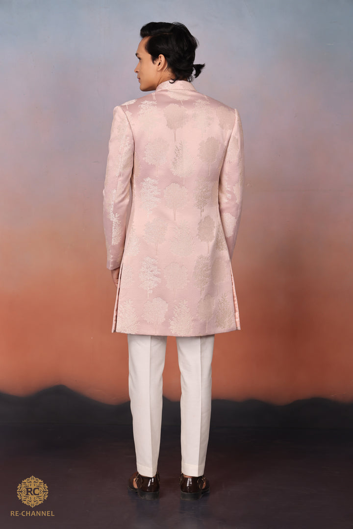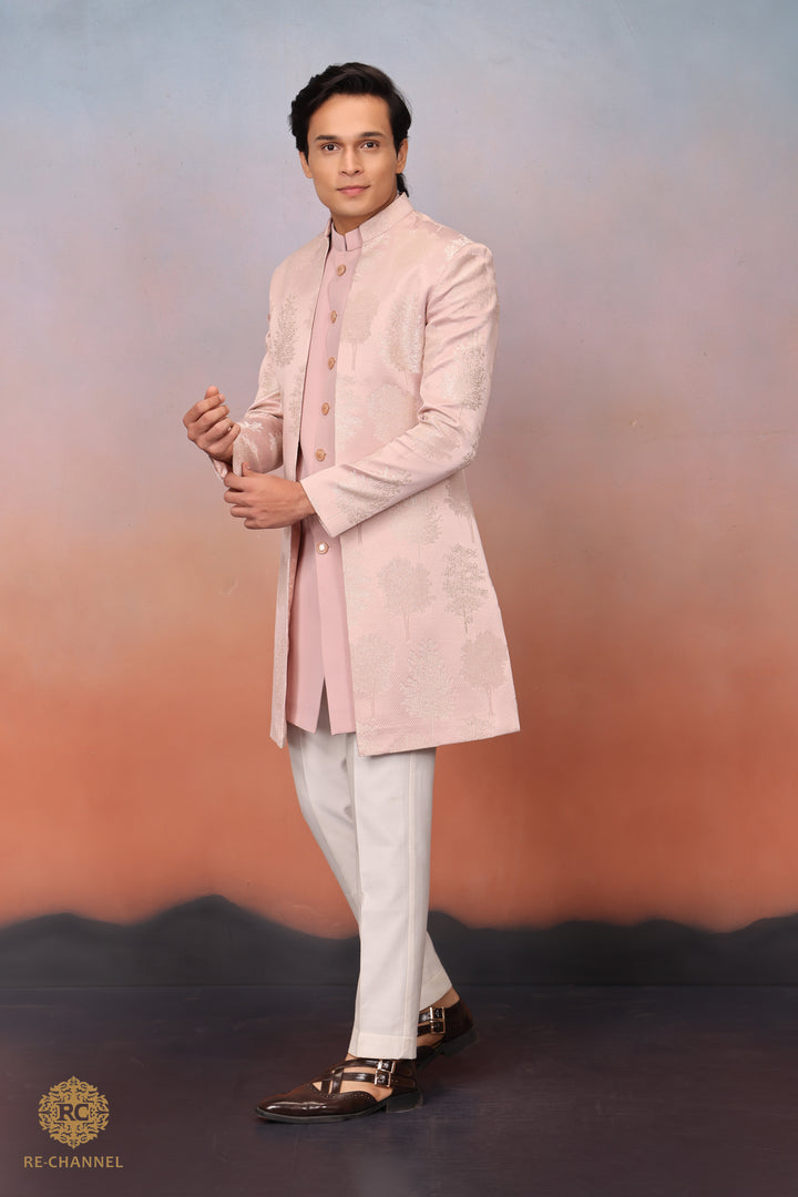 Product Details: This Light Pink Jacquard Indo-Western is a vision, paired perfectly with a matching inner collar button jacket and crisp white trousers for a complete ensemble.