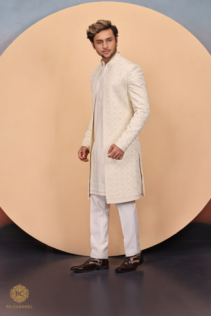 Product Details: This Off White Indo-Western Open Jacket showcases delicate self-colored resham embroidery in intricate floral motifs. Paired with a matching off white kurta adorned with a vertical chain stitch pattern and aligadhi pants, it epitomizes elegance and style.