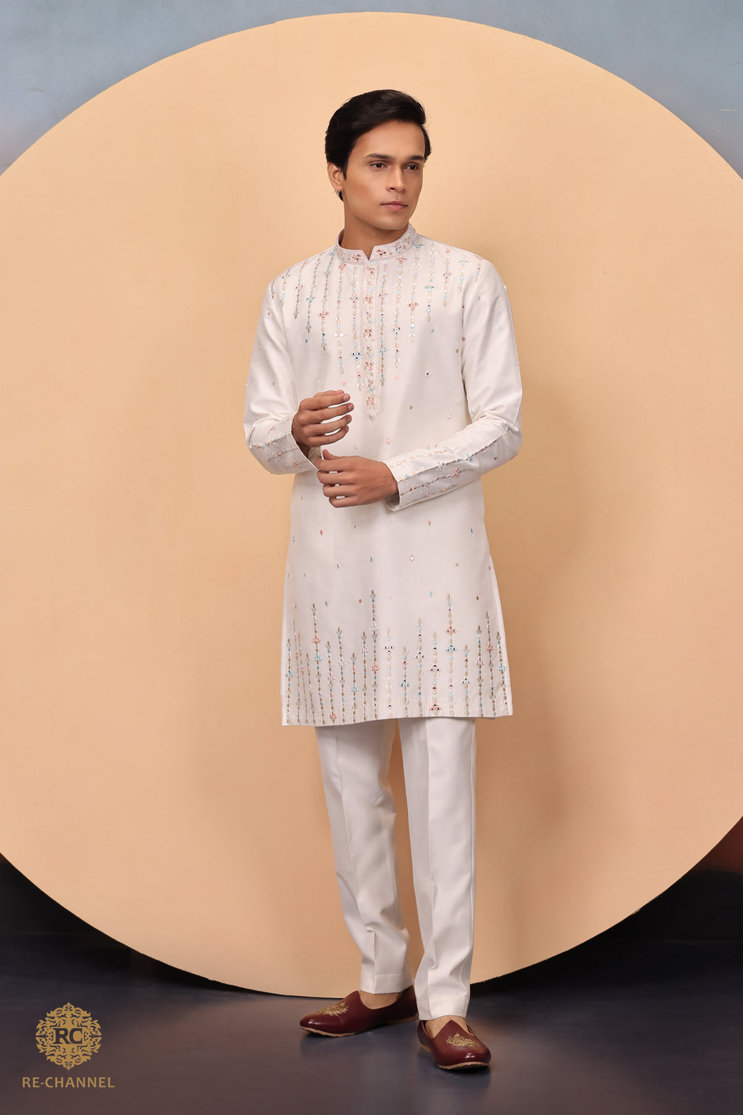 Product Details: Elevate your style with our Off White Mirror Work Silk Kurta Set adorned with resham and mirror work. Complemented by a matching silk kurta and aligadhi pants, this ensemble epitomizes refined style and contemporary grace.