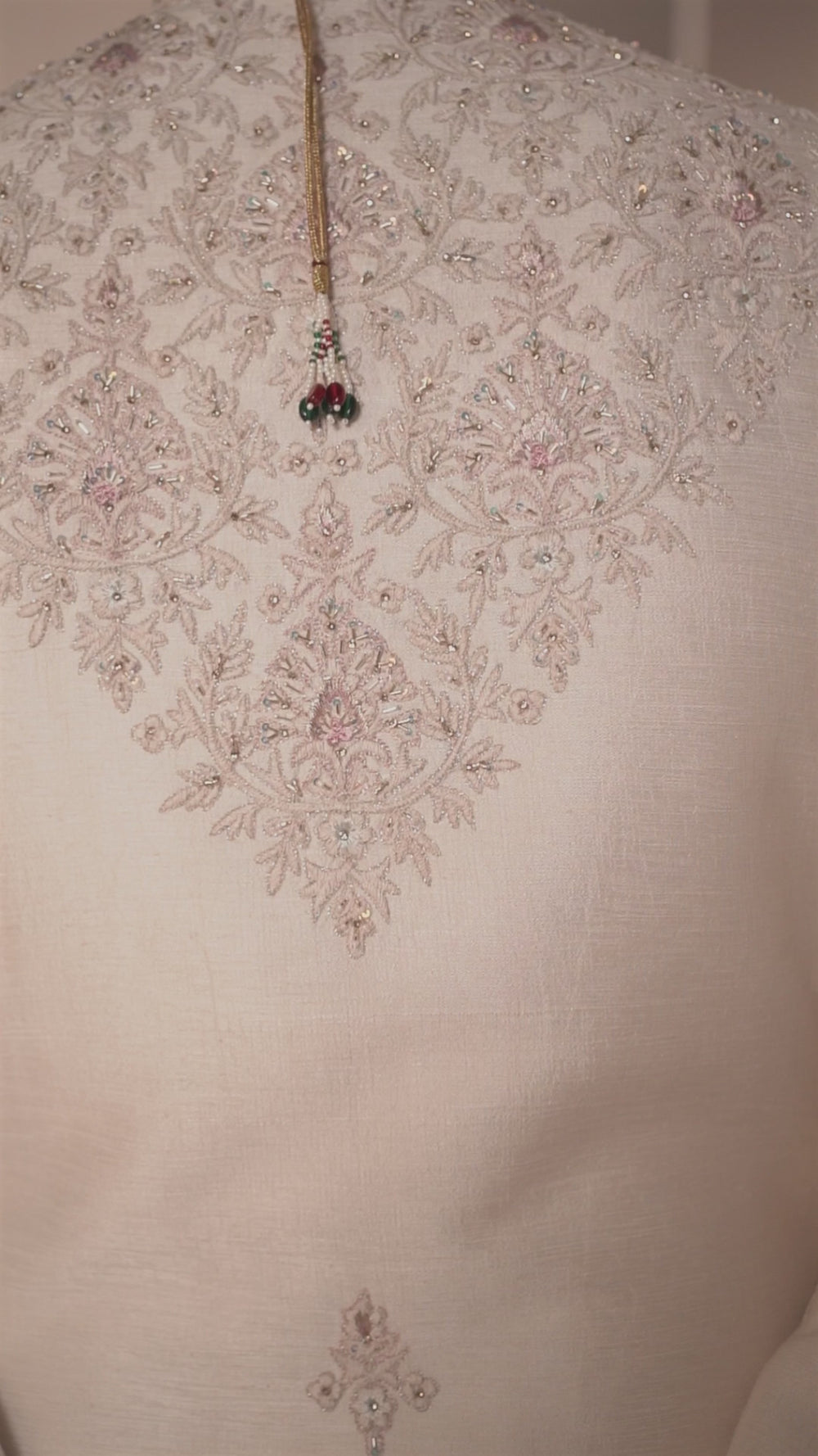 Explore our luxurious fabric collection that is used for crafting the best dulha sherwanis. From ethnic festive rich silks to elegant brocades with intricate embroideries & this is how our Indian wedding sherwani outfit is crafted from the finest materials to give both comfort and style. Along with this, we use Lucknowi & Chanderi fabric. Sherwani paired with Churidar trousers, peshwai , inner straight kurta with royal accessories that make a complete look. Handcrafted embroidery is adopted using different techniques and styles like salli, resham, zari, tikki, poth, cutpoth, french knots, sadi & kora work. In every ReChannel’s sherwani for men, you can experience luxury, sophistication & comfort. Whether you prefer a traditional silk sherwani or a contemporary design in velvet, jacquard, ReChannel offers a variety of fabrics to suit every preference.