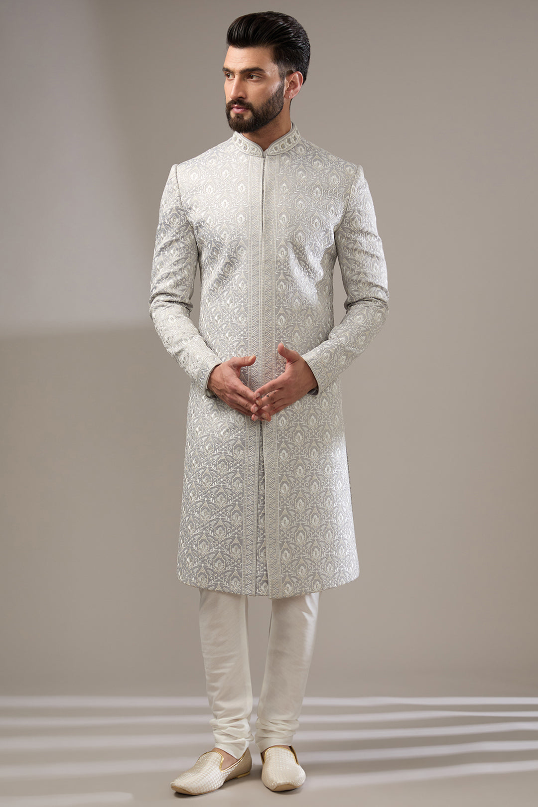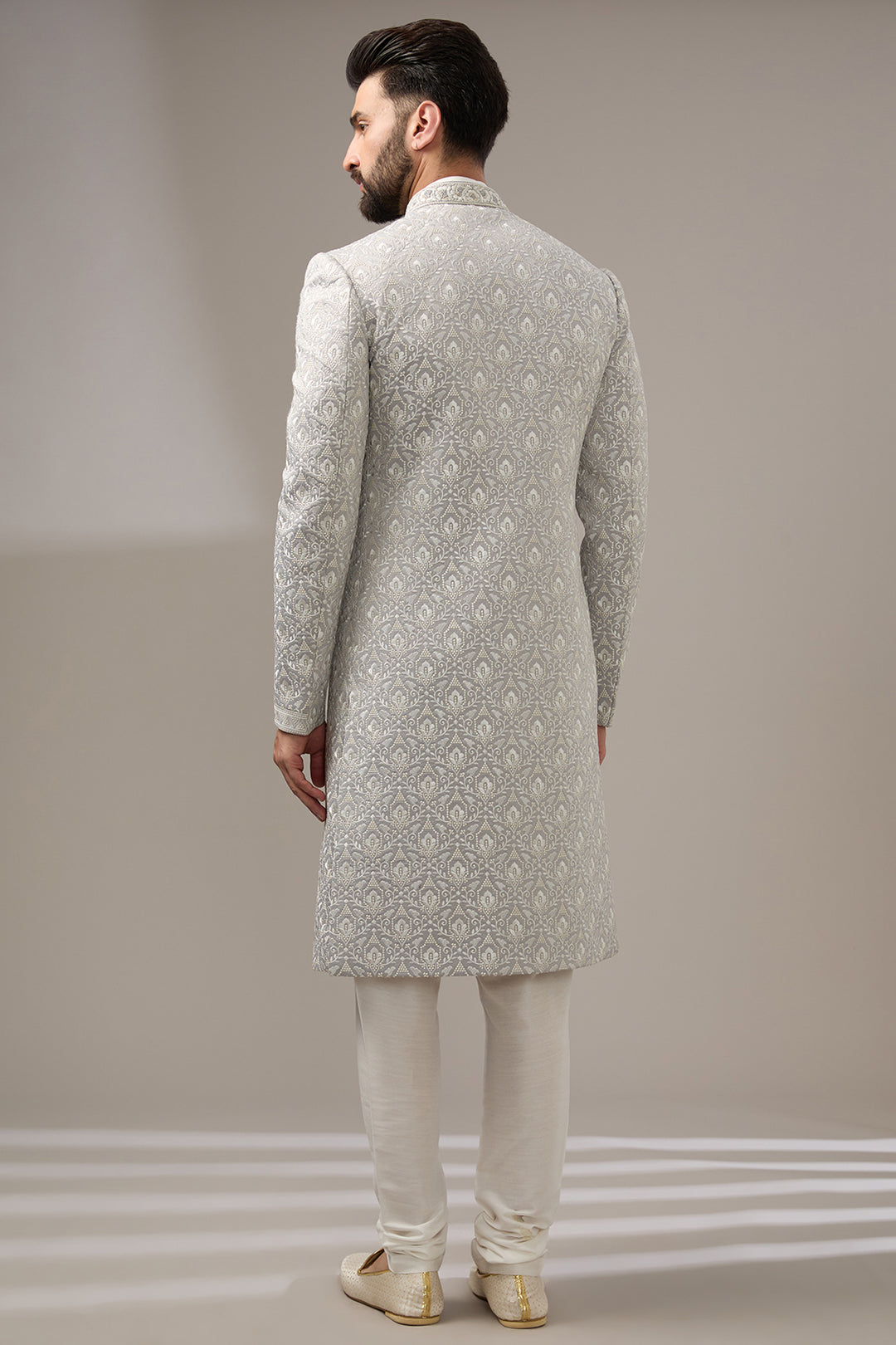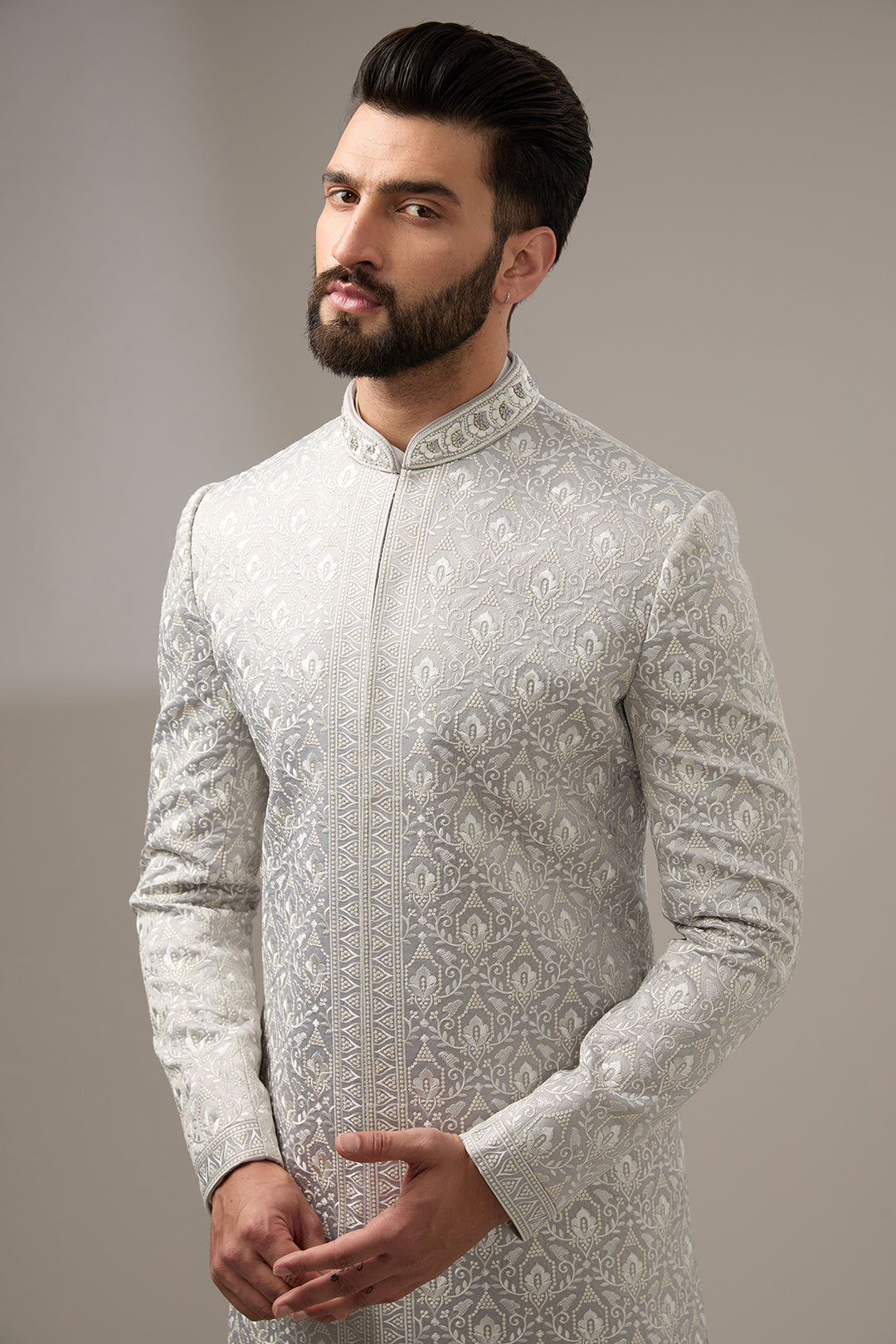 Embrace sophistication with our Grey Sherwani adorned with intricate silver zari resham work. The main emphasis lies on the collar, featuring floral and geometric patterns, adding a touch of timeless elegance. Perfect for the discerning groom seeking refinement on his special day.