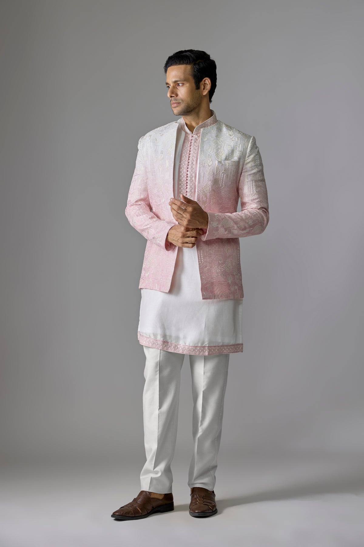 Exude charm and elegance with this White-Pink Indo-Western outfit. Made from premium textured fabric, it features intricate thread and sequin embroidery. The graceful white-to-pink tone creates a sophisticated ombre effect, perfect for weddings, receptions, engagements, and festive gatherings.